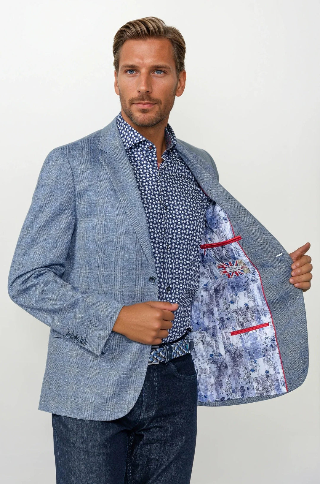 Luxe Non-Iron Printed Sport Shirt in Light Blue with Red Print