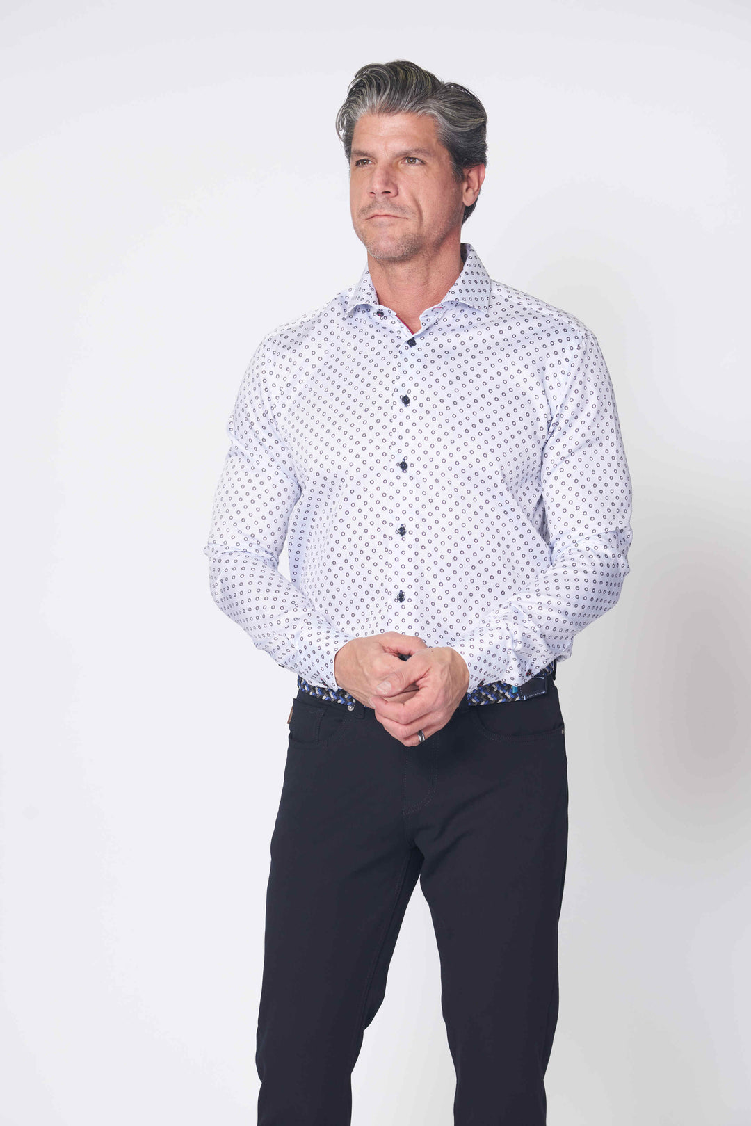 Luxe Non-Iron Printed Sport Shirt in White with Navy Print