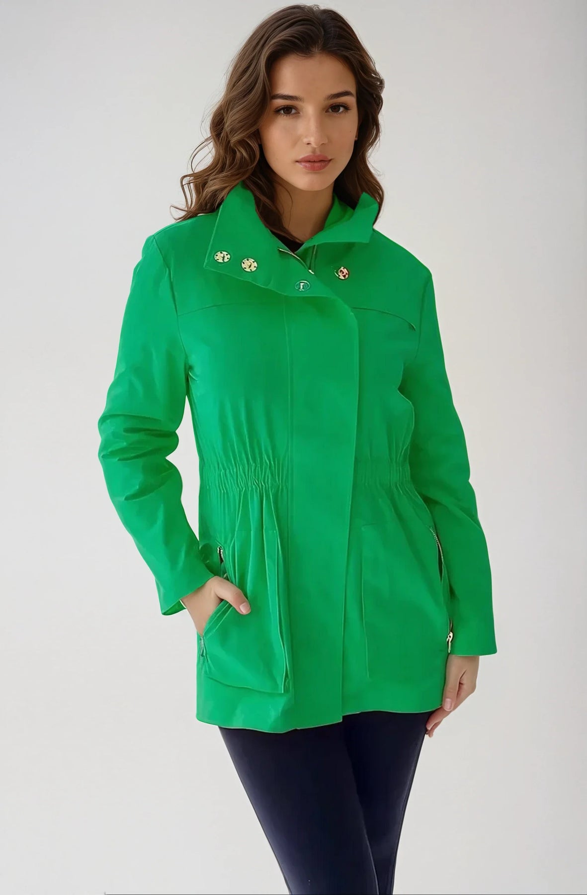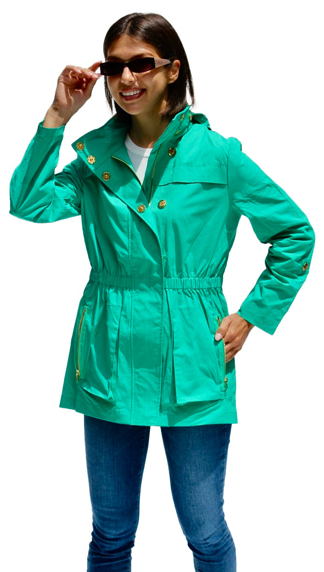style ANNA - new fabric developed by Ciao Milano.  Soft durable flowing fabric breathable slick feeling. that is not only 100% water proof but extremely rich looking.  Looks like a million dollars.  100% polly.  A more shinny look than the Tess fabric. Same style, hardware, specs and fit with zip in pouch hood as the famous TESS style.