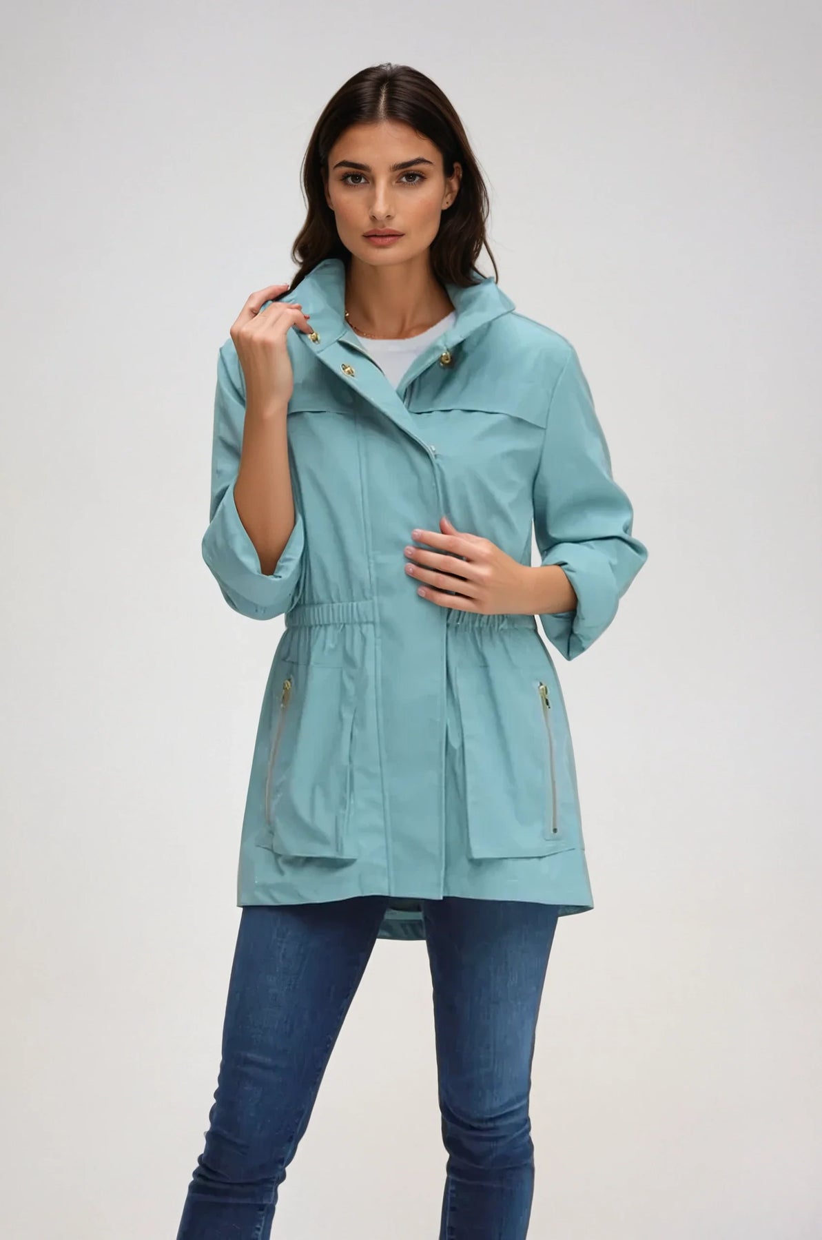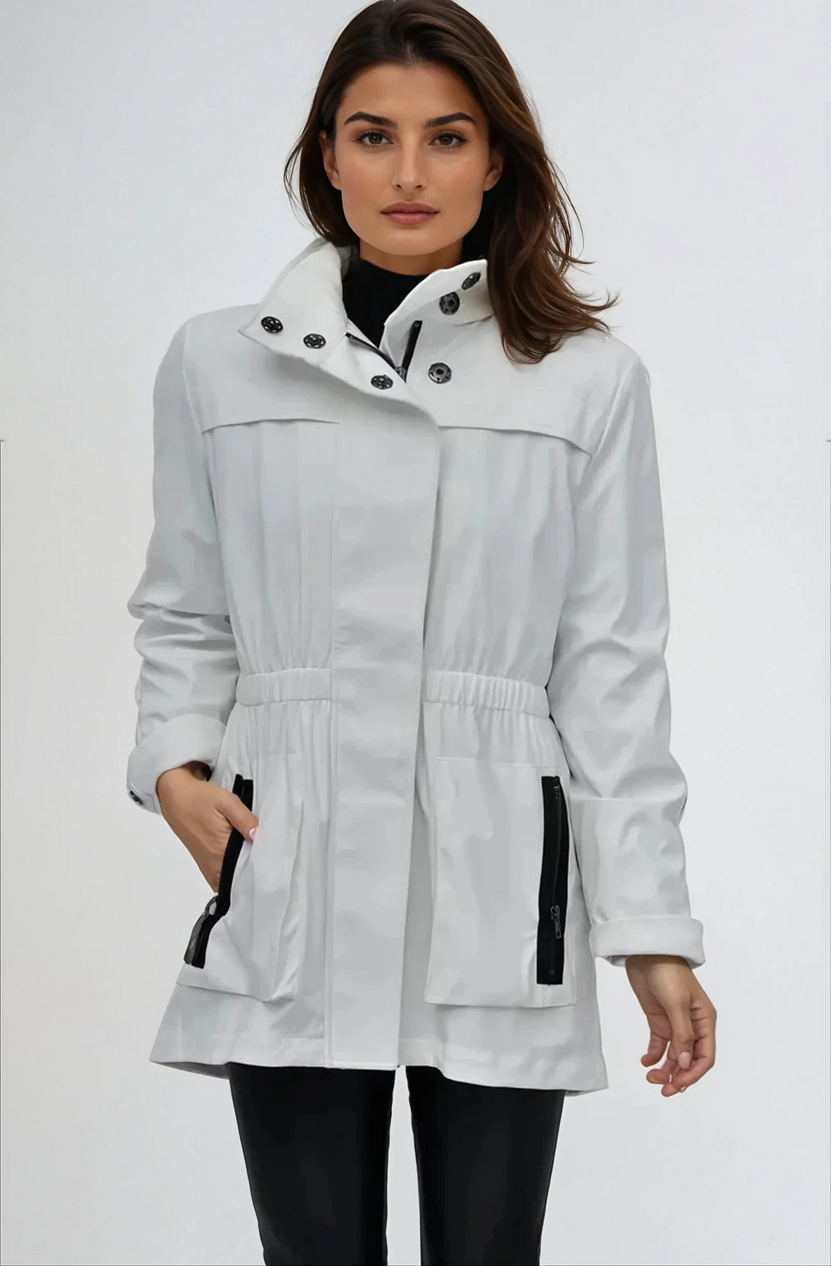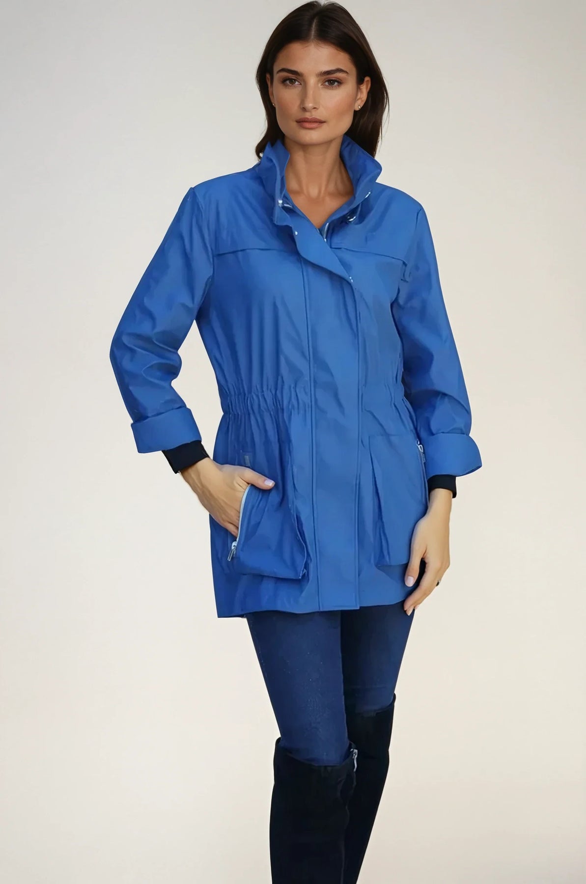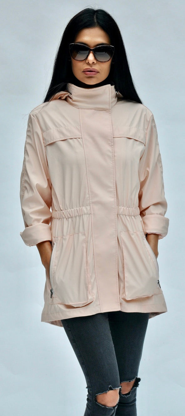 style ANNA - new fabric developed by Ciao Milano. Soft durable flowing fabric breathable slick feeling. that is not only 100% water proof but extremely rich looking. Looks like a million dollars. 100% polly. A more shinny look than the Tess fabric. Same style, hardware, specs and fit with zip in pouch hood as the famous TESS style.