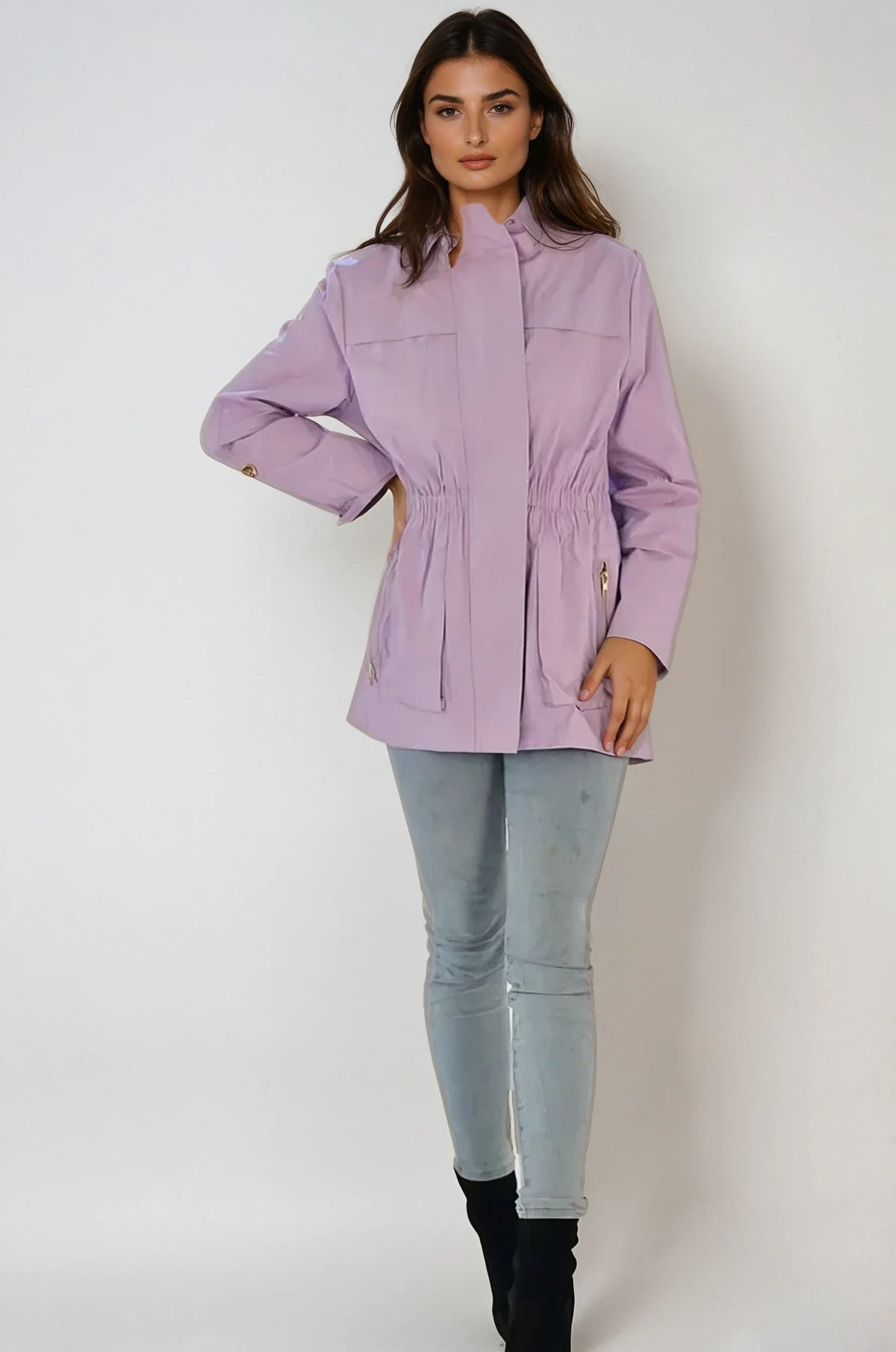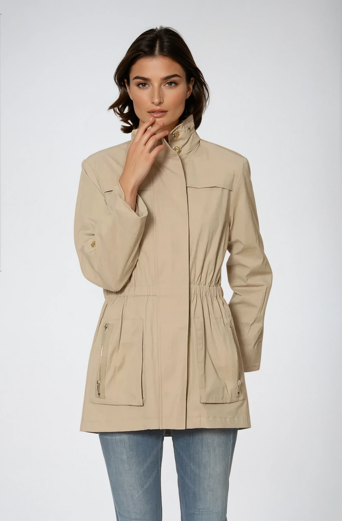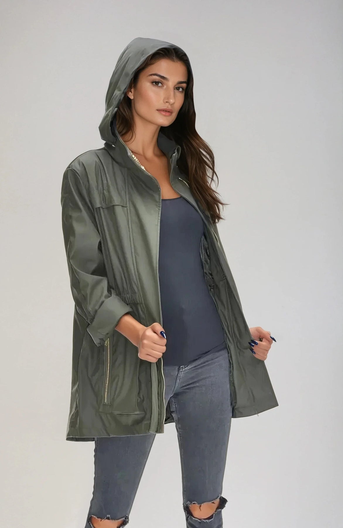 style ANNA - new fabric developed by Ciao Milano. Soft durable flowing fabric breathable slick feeling. that is not only 100% water proof but extremely rich looking. Looks like a million dollars. 100% polly. A more shinny look than the Tess fabric. Same style, hardware, specs and fit with zip in pouch hood as the famous TESS style.