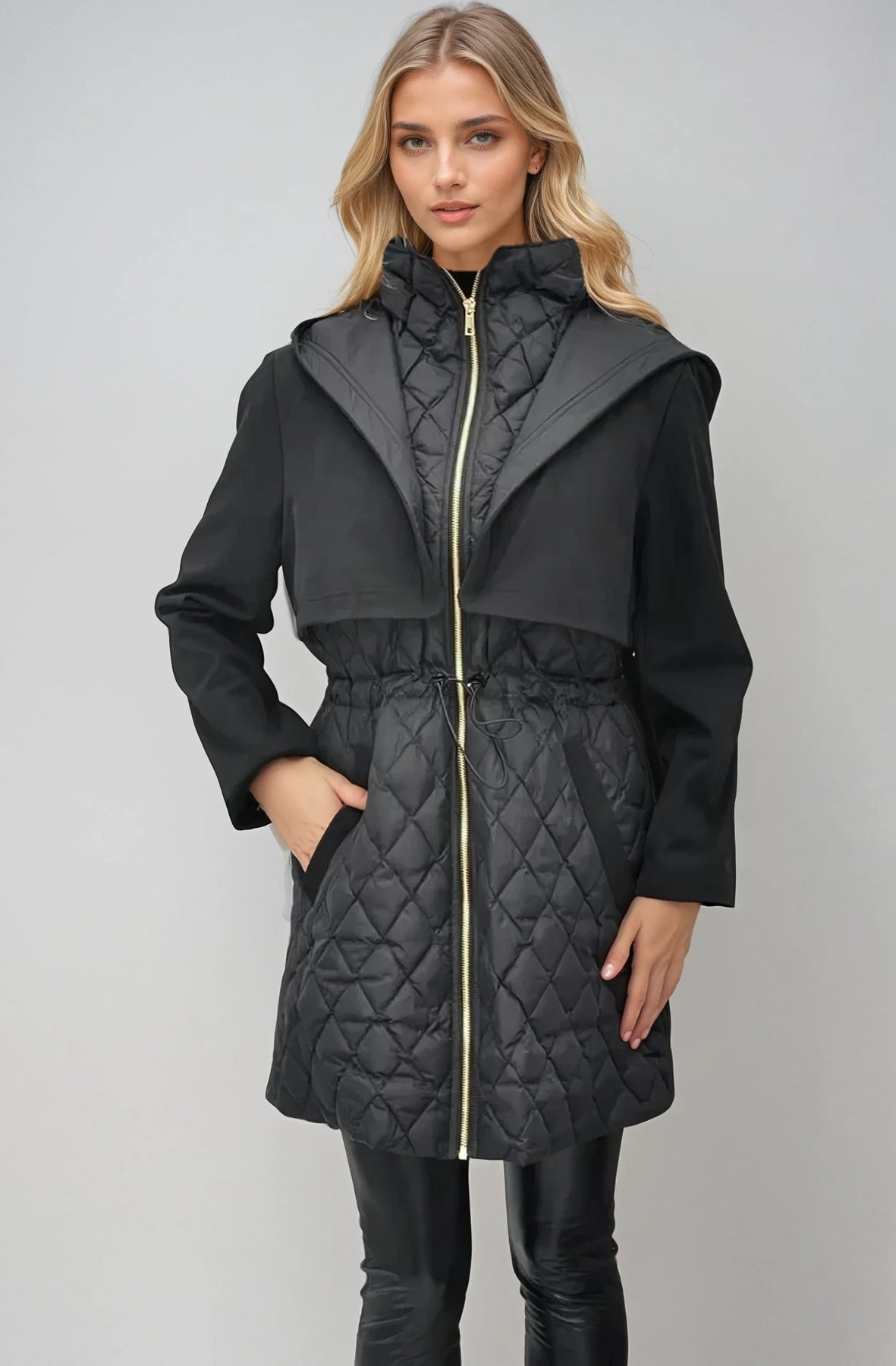 Daria - Scuba fabric for extra warmth and style. Down quilted diamond duck filled down. Lay down hood.