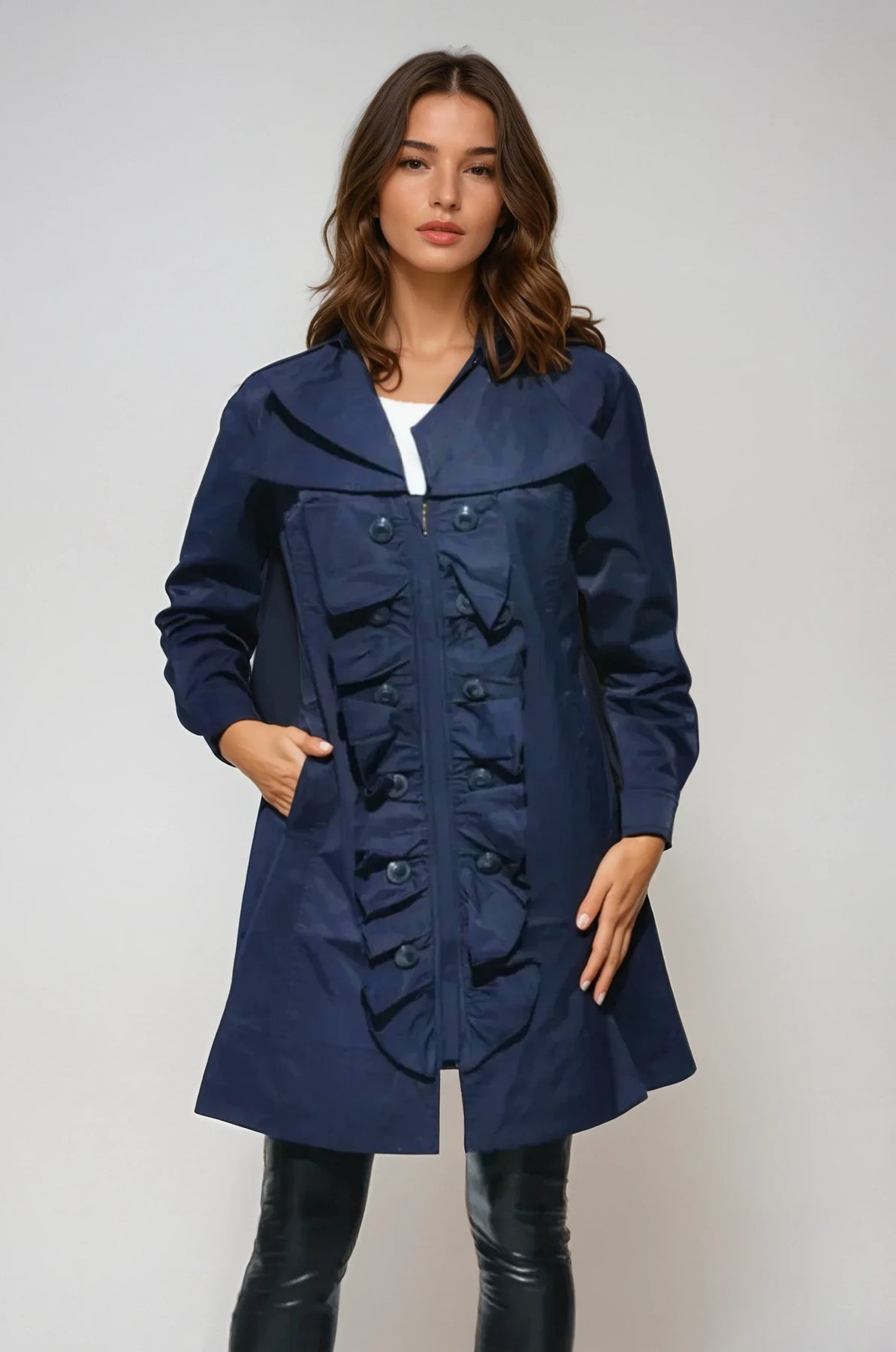 Knee length raincoat using the same water resistance fabric as styles Tess, Savina, Lana, Elena, Ula, Celina and Tina. Lined with satin. Embellished with pearl buttons to match the shell of the jacket. Ruffle front to coincide with the now European trend on many apparel.