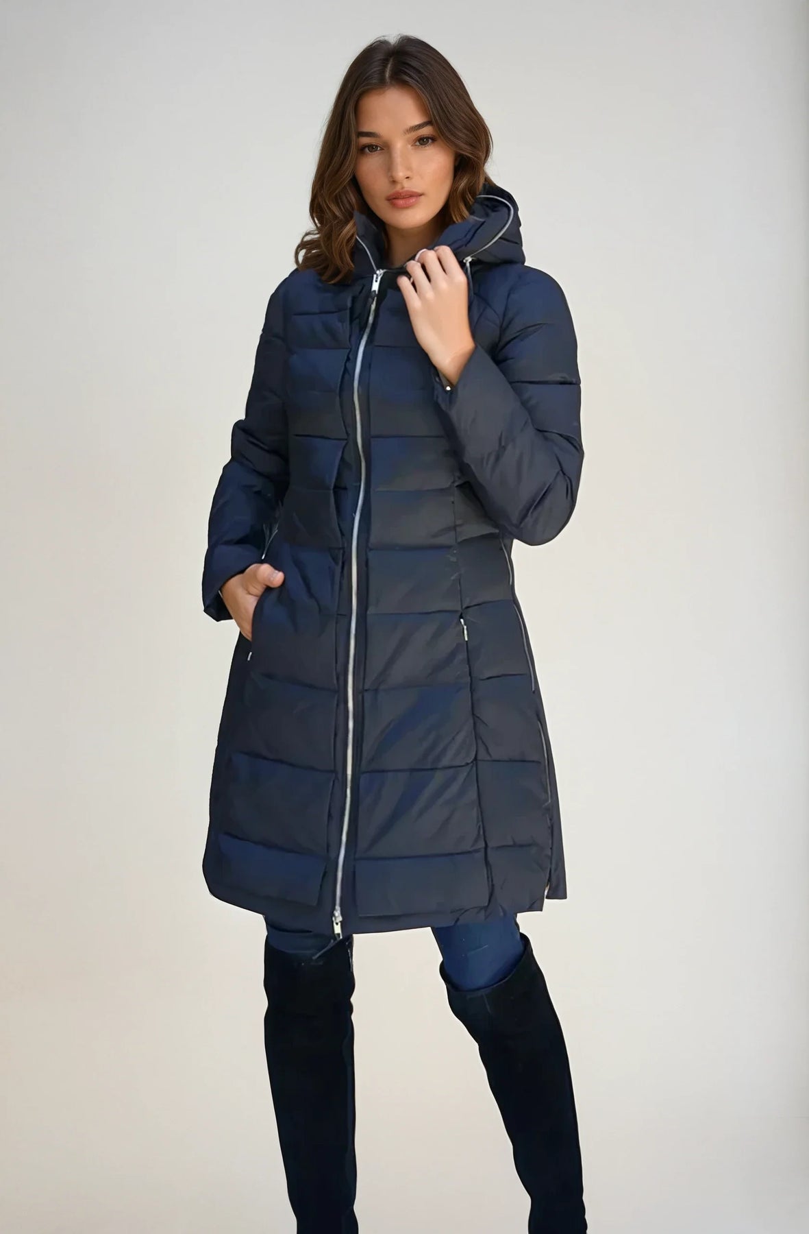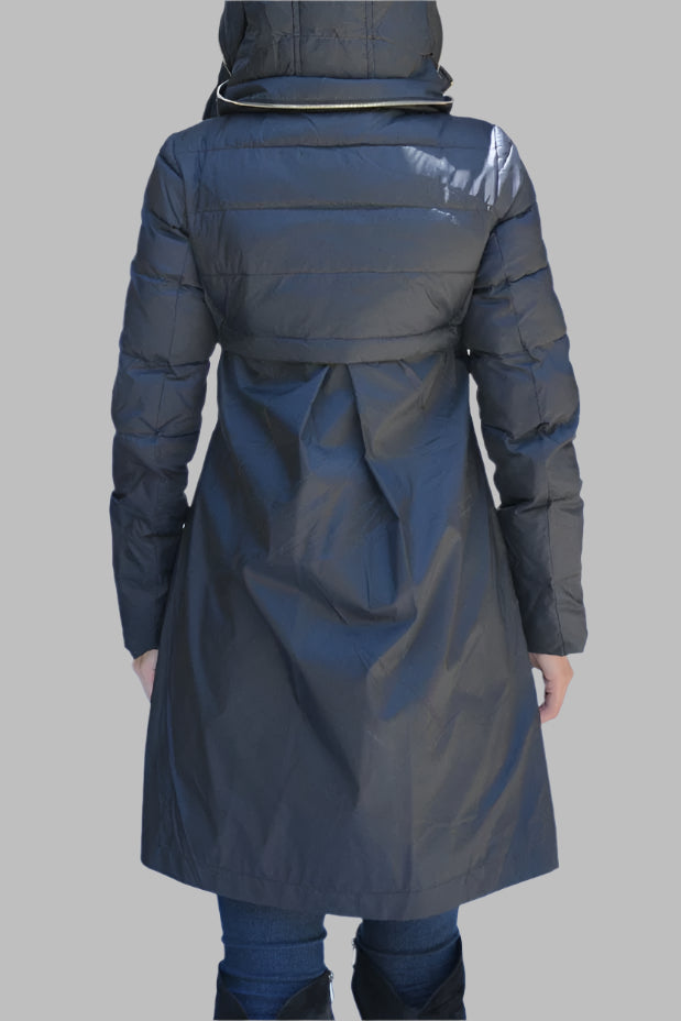 A blend of goose down fill, light weight, water resistance and a very large hood is just the gravy when wearing this incredible high fashion puffer coat. You can throw that North Face sleeping bag away you have been wearing for five years. Side zip panel for more sitting room. Back flap covering the coat for extra water resistance when sitting on snowy surfaces. Stuck proof zippers as in all our coats and jackets. You will be the envy of winter lookers. Comparable to a $2800 coat from Italy.
