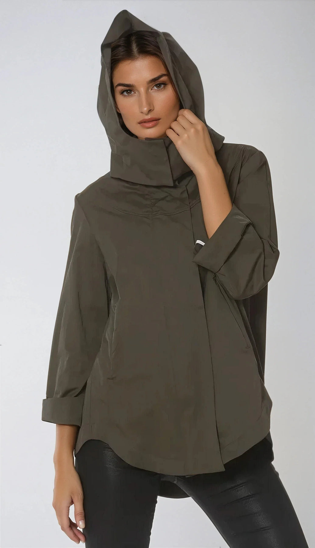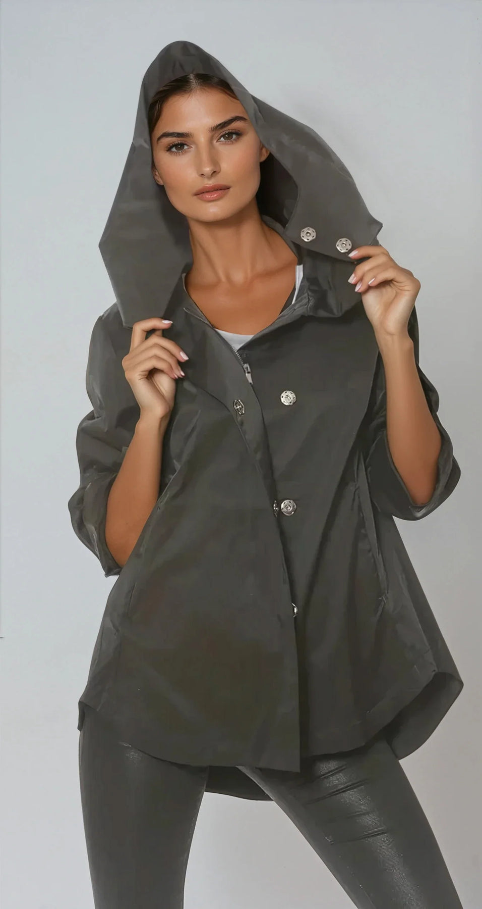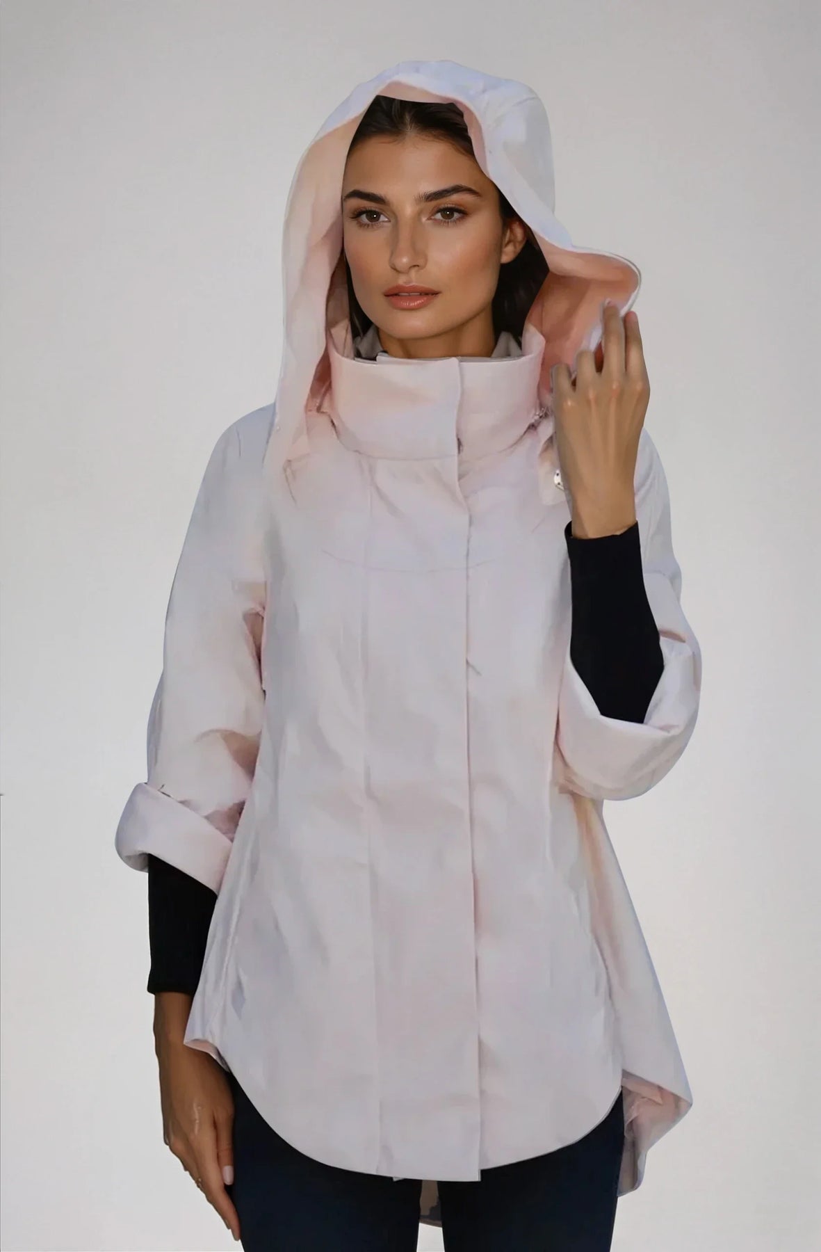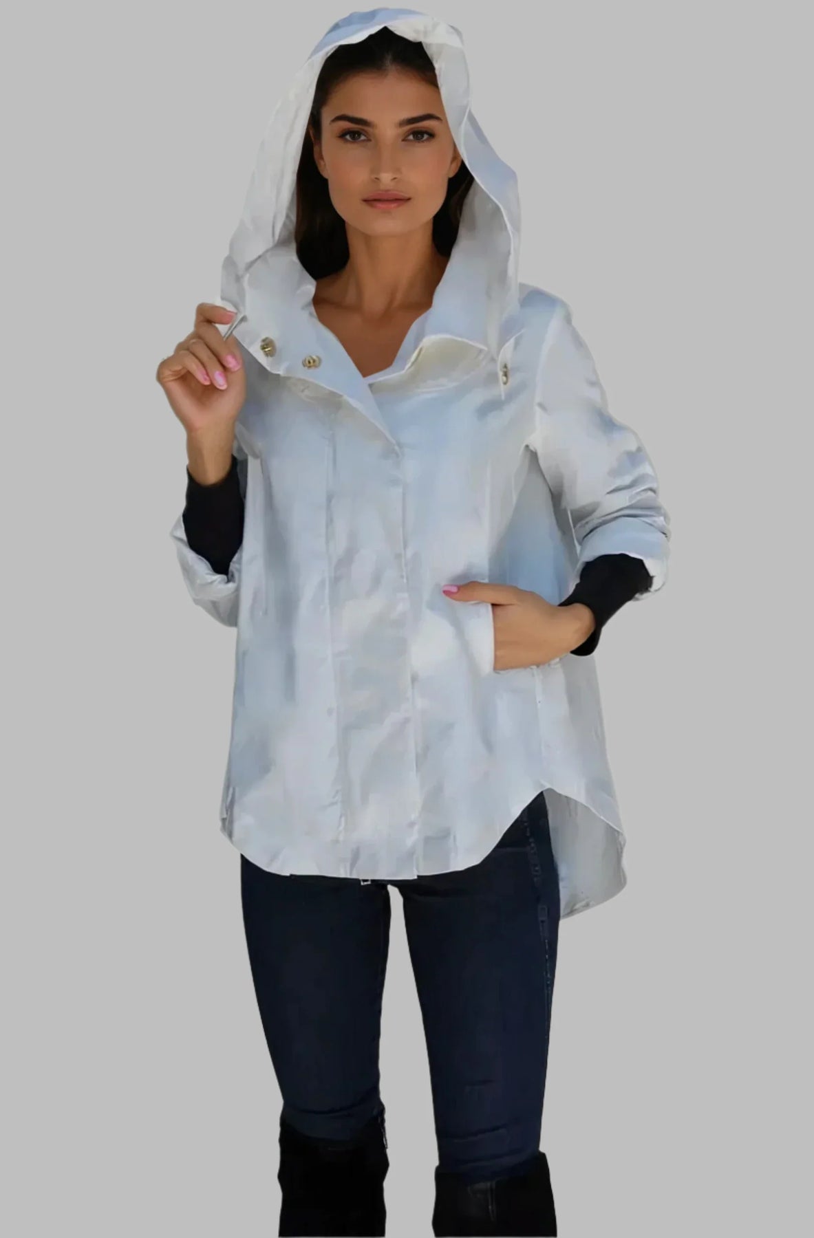 style SAVINA Same fabric and hardware as TESS but with a very sophisticated zip-off hood. It has the same adjustable sleeves that can be left at full length or cuffed and snapped to a fashionable ¾ sleeve. Hidden side pockets on each side of the jacket are also well placed. SAVINA is unlined with taped seams and the length is shorter in the front than the back. Fabric has a cotton feel to it. Cotton Poly Lycra blend.