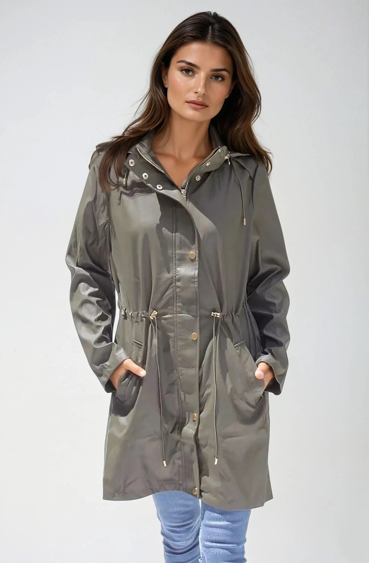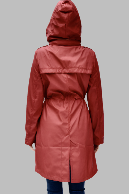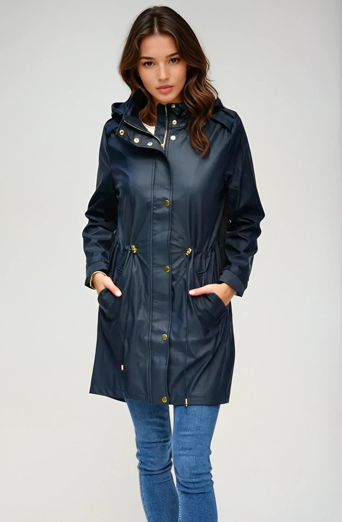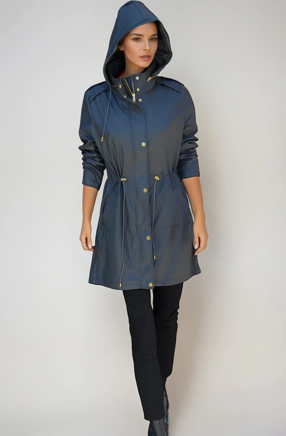 style SERENA - new fabric developed by Ciao Milano. Soft durable flowing slick feeling fabric. 100% water proof but extremely rich looking. Looks like a million dollars. Same style, hardware, and fit as TESS, ANNA, NIA etc., but extra longer to mid thigh with adjustable waist.