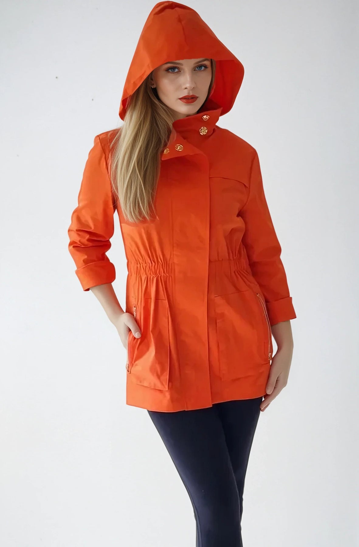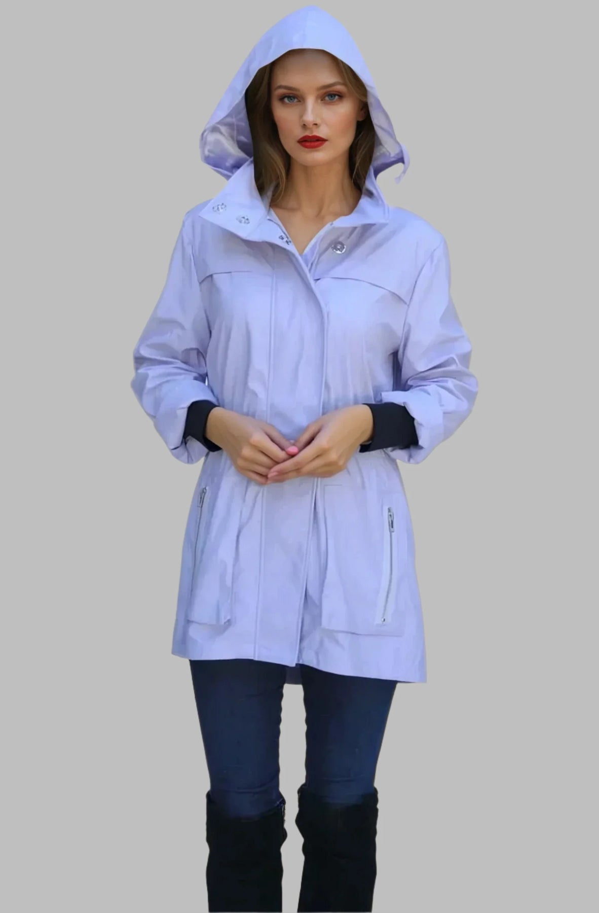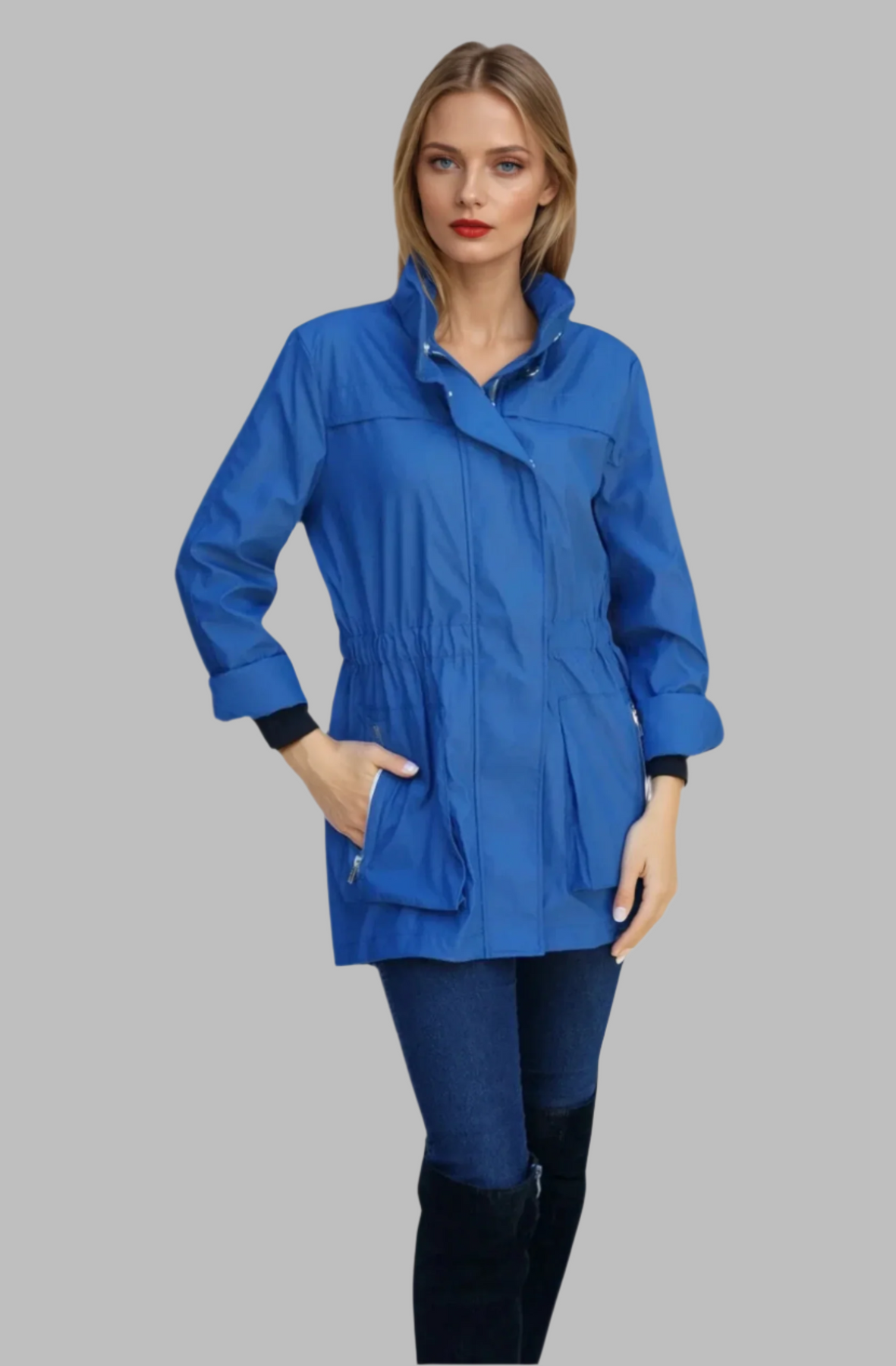 The Ciao Milano Tafani is a very lightweight, unlined version of our best-selling Tess. Like the Tess, Tafani features an elastic waist band that accentuates your shape and won't lose its elasticity. The funnel collar with zipper hides away the hood. The adjustable sleeves can be left at full length or cuffed and snapped to a fashionable ¾ sleeve. Zip patch pockets and shinny Gold or Silver hardware finish off this water resistant and stylish fashion jacket. Fits in the purse.