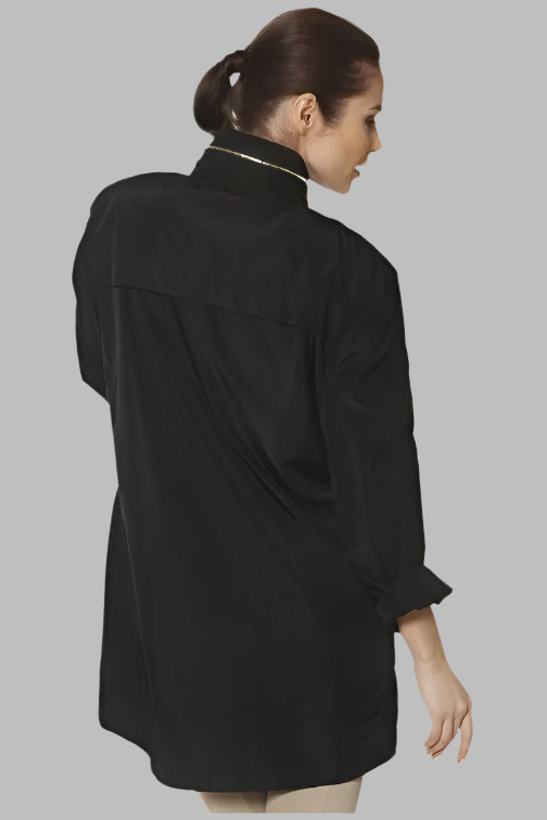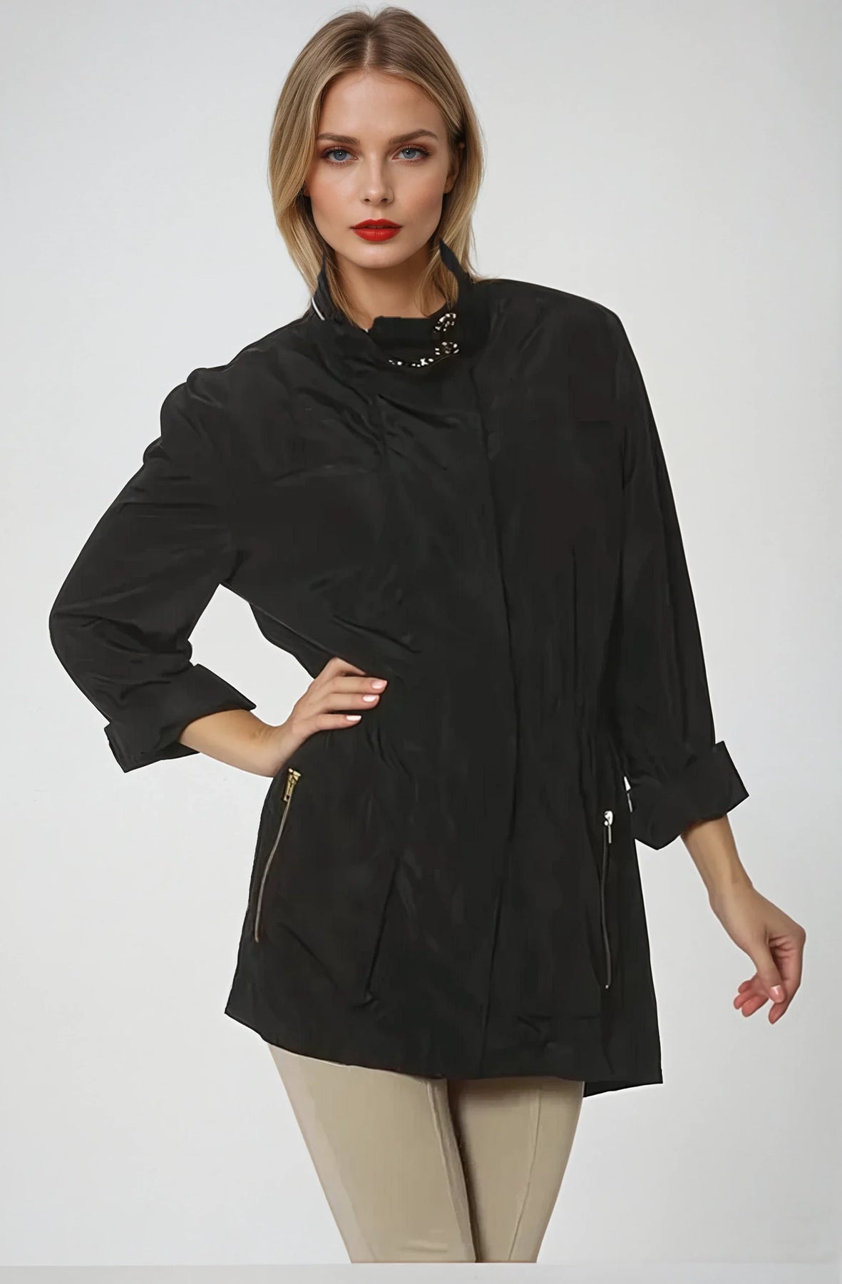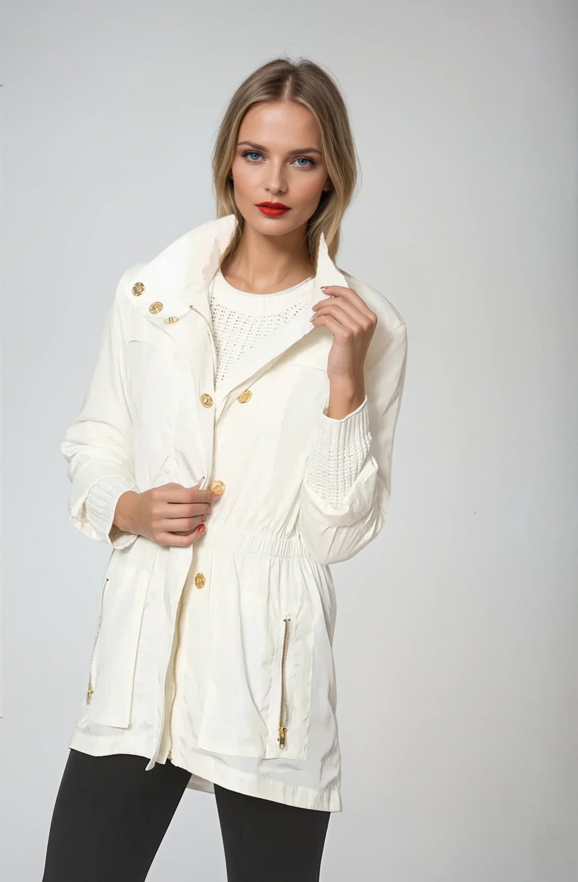 The Ciao Milano Tafani is a very lightweight, unlined version of our best-selling Tess. Like the Tess, Tafani features an elastic waist band that accentuates your shape and won't lose its elasticity. The funnel collar with zipper hides away the hood. The adjustable sleeves can be left at full length or cuffed and snapped to a fashionable ¾ sleeve. Zip patch pockets and shinny Gold or Silver hardware finish off this water resistant and stylish fashion jacket. Fits in the purse.