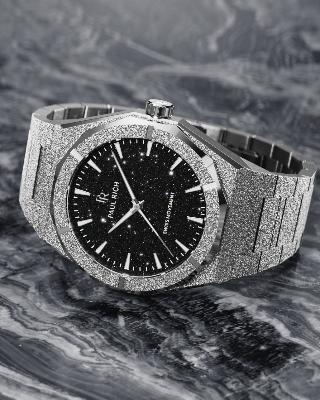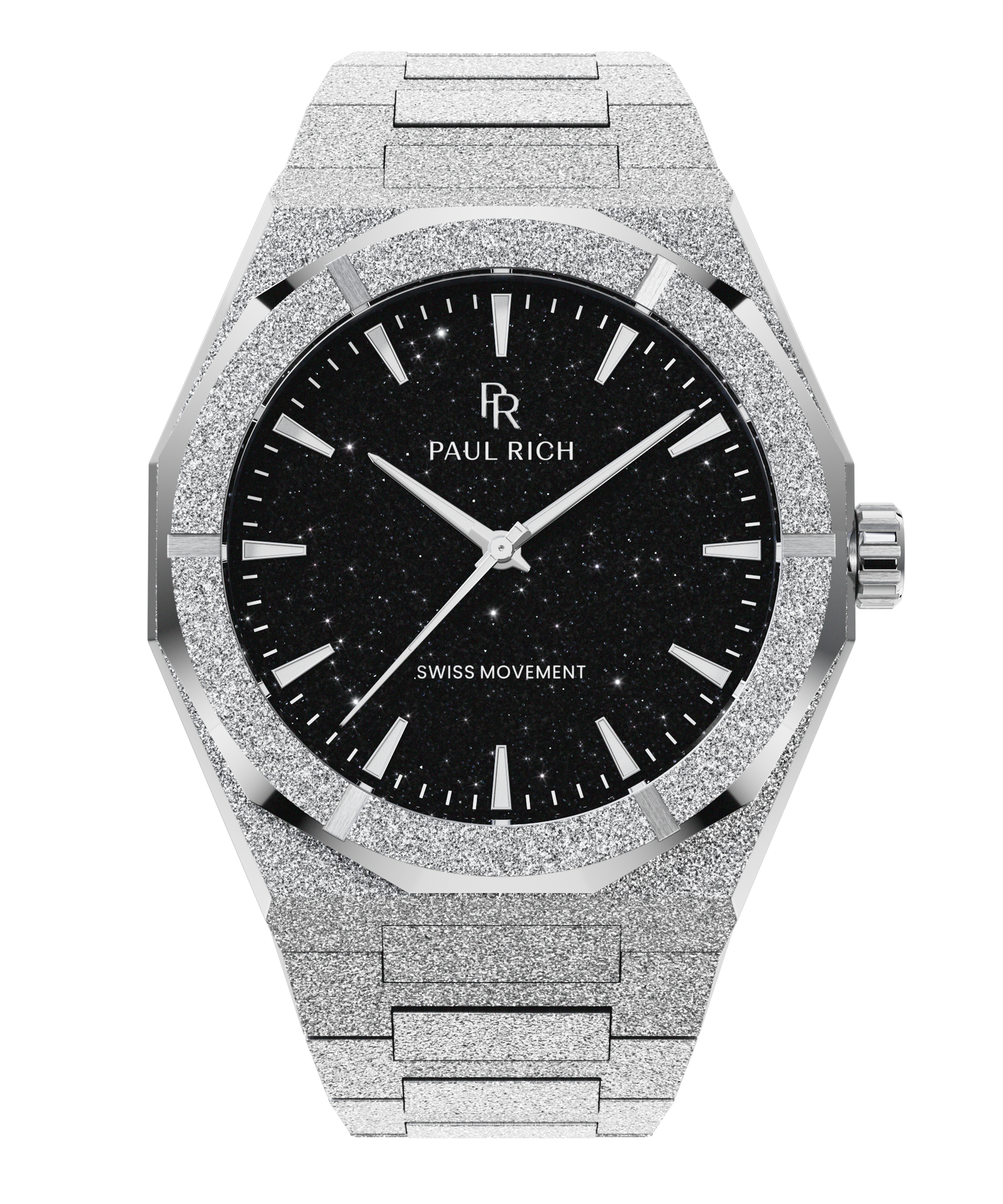 Dark. Rare. Powerful. A black aventurine dial, capturing the depth of the night sky. Wrapped in stainless steel with a frosted finish that hits like diamond dust. This isn’t just a watch—it’s a statement. Step into The Void.