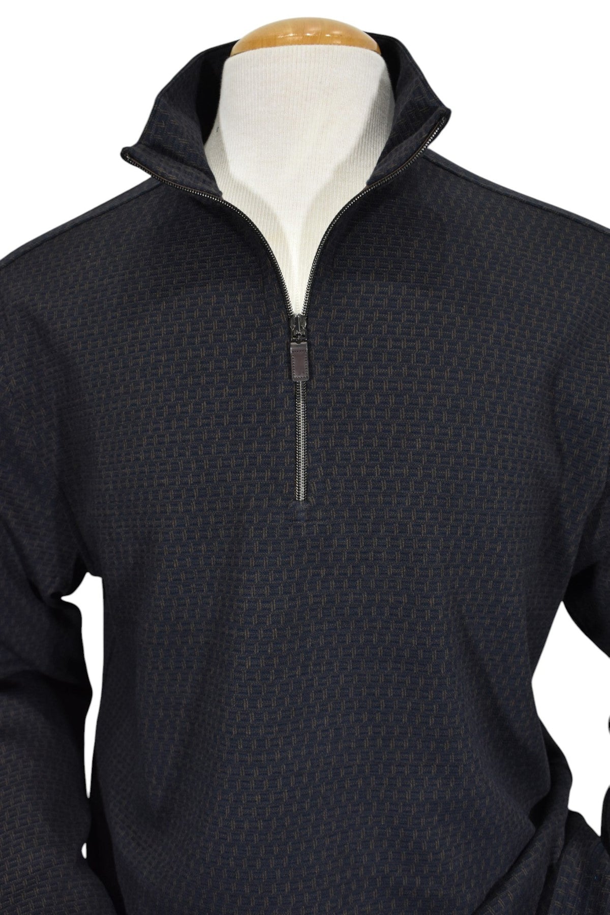 Experience comfort and style with our Marcello Buckhead Quarter Zip. The classic design features open sleeves and an open bottom for a contemporary flair. Made with ultra soft cotton and viscose blended yarns, in a rich diamond pattern of black and chocolate.