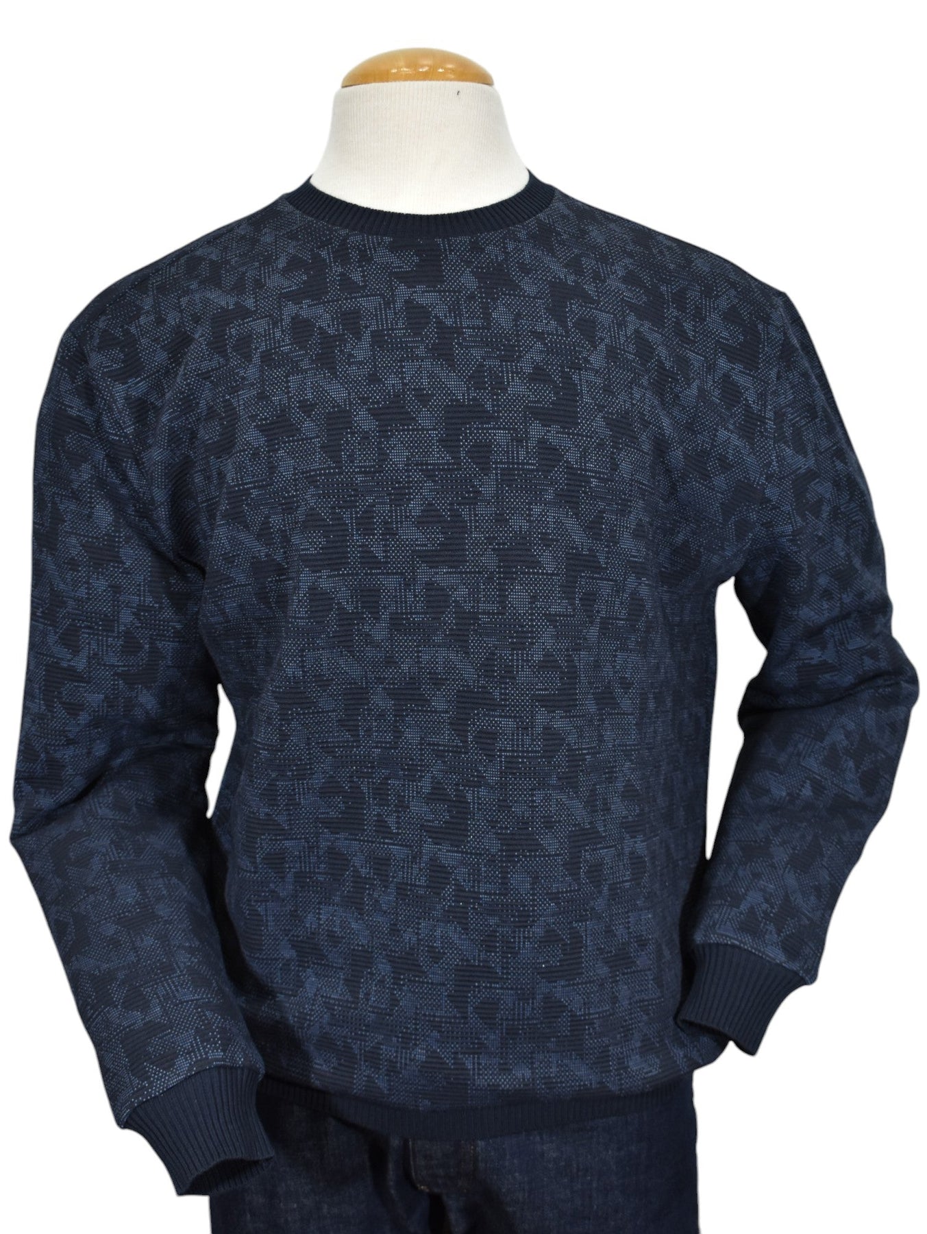 Elevate your style with our Marcello Navy Geometric Sweater! Crafted in rich navy with stunning shades of blue, this classic crew neck design is both sophisticated and stylish. The unique geometric pattern adds a touch of elegance to any outfit, making it the perfect complement to blue pants or your favorite jeans. Upgrade your wardrobe today!