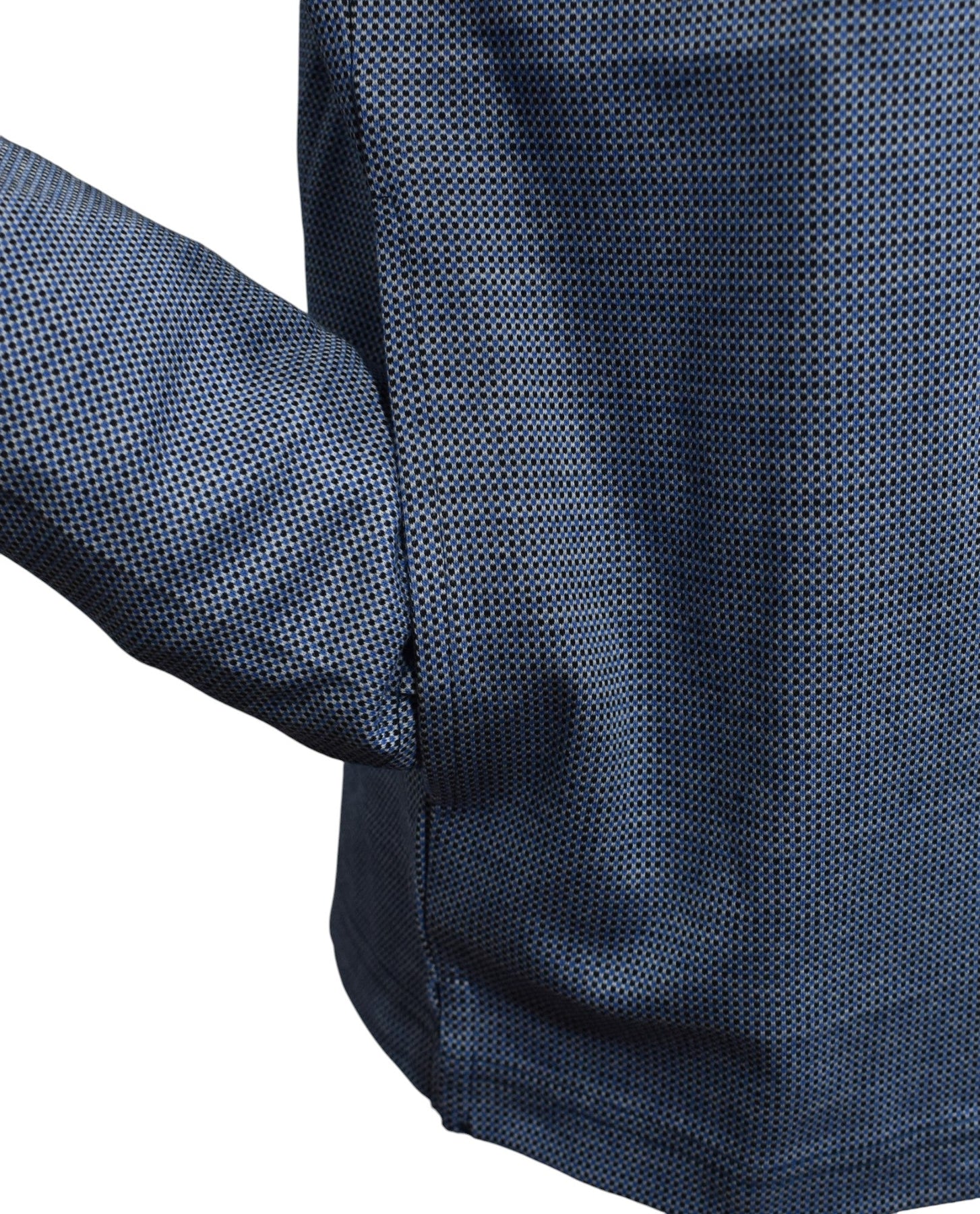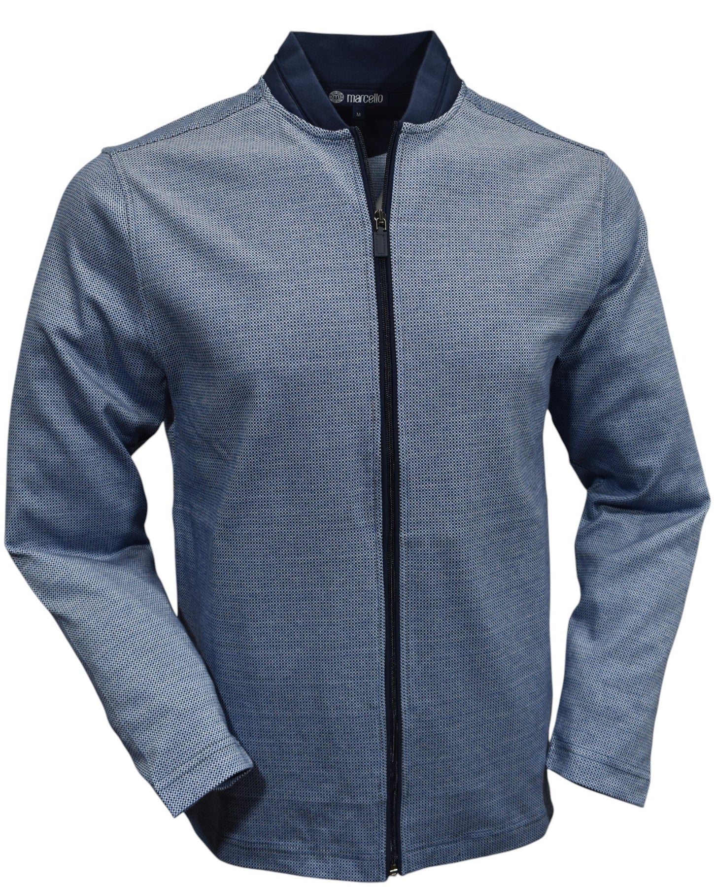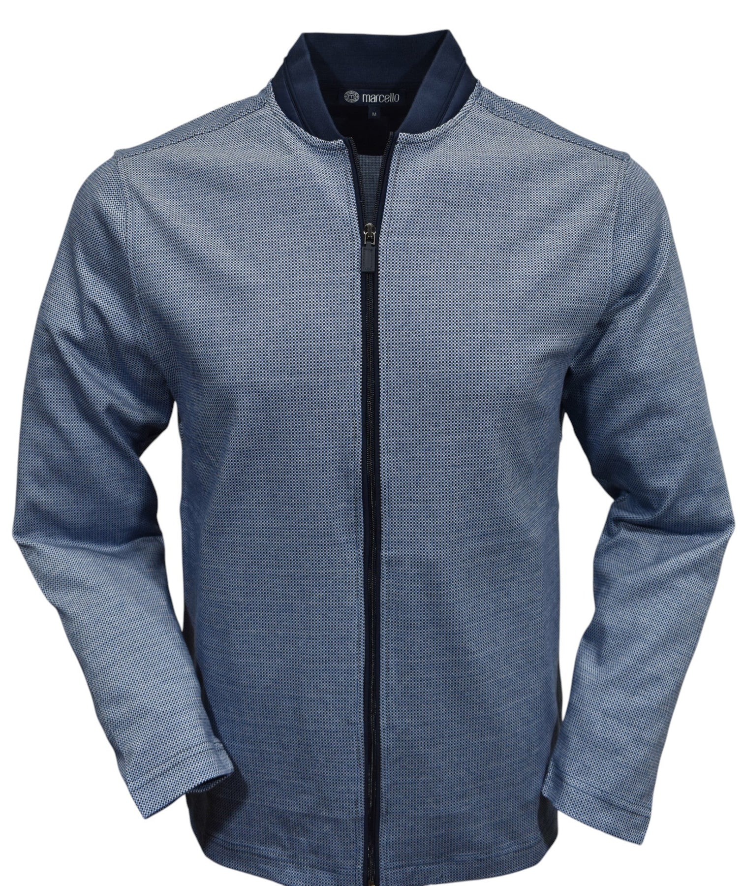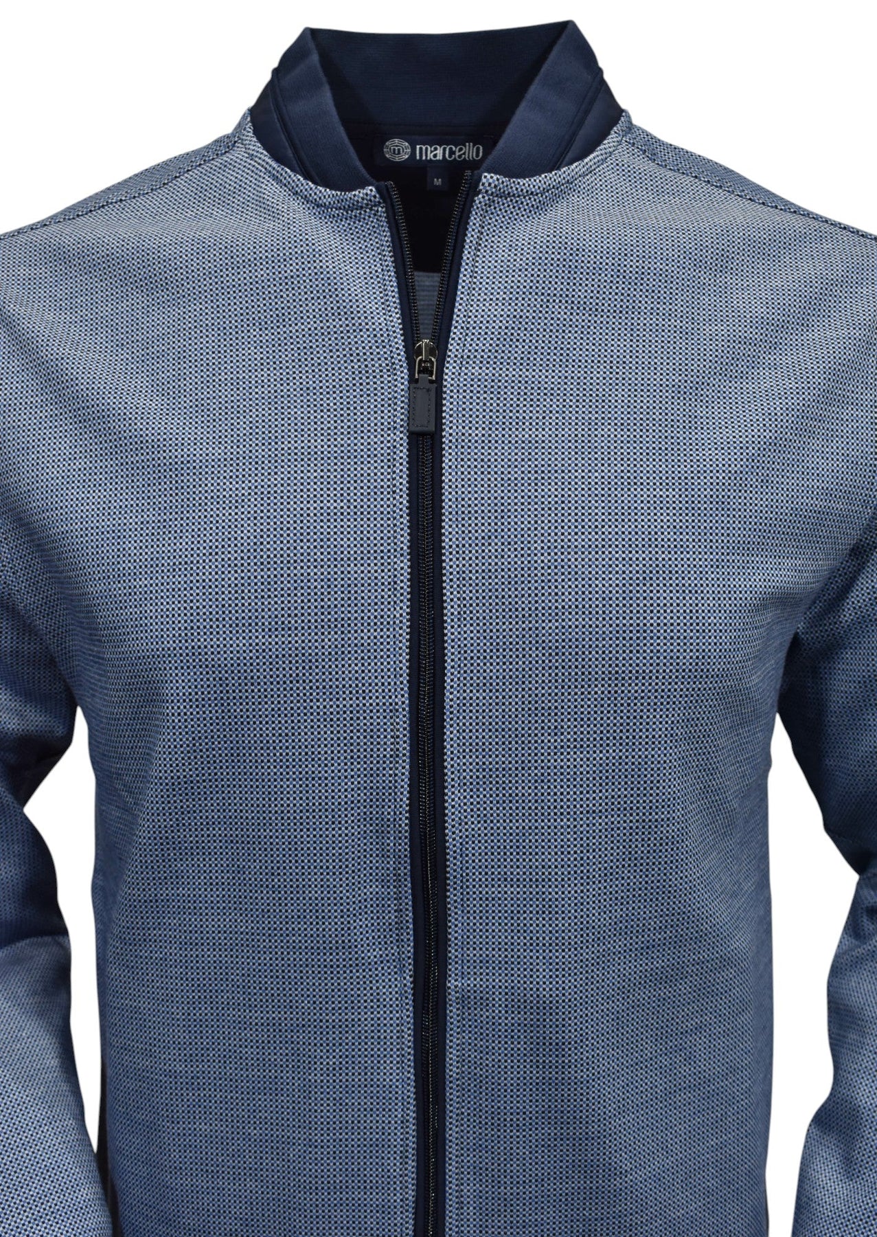 Pick up this cool trendy cardigan in soft cotton fabric as a layering piece or to wear as fashion item with a tee. The pattern features a fine box pattern in navy, blue and white. A cool baseball type collar with added detailing, side seam pockets and open sleeves and bottom for a contemporary cool look. Modern fit.