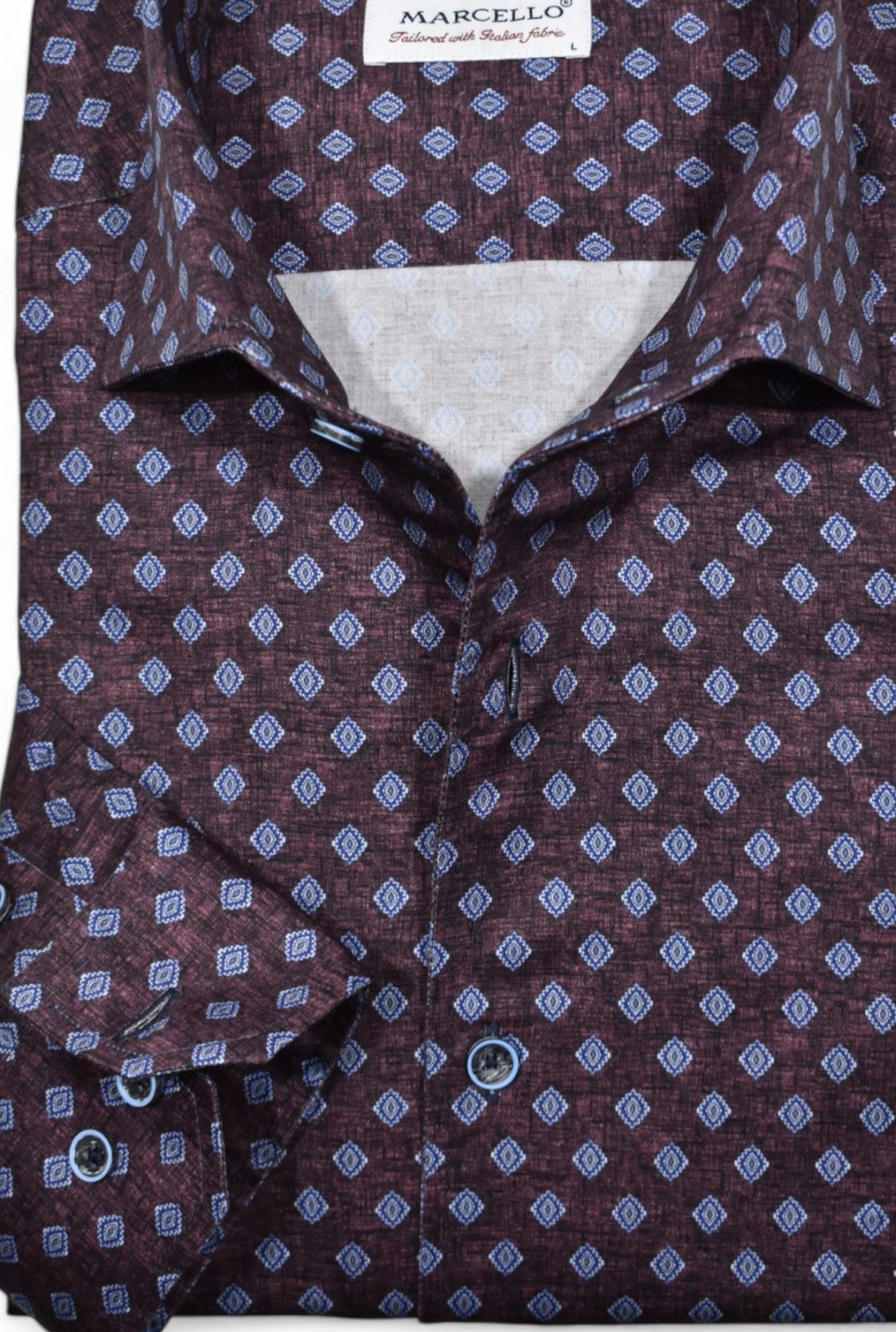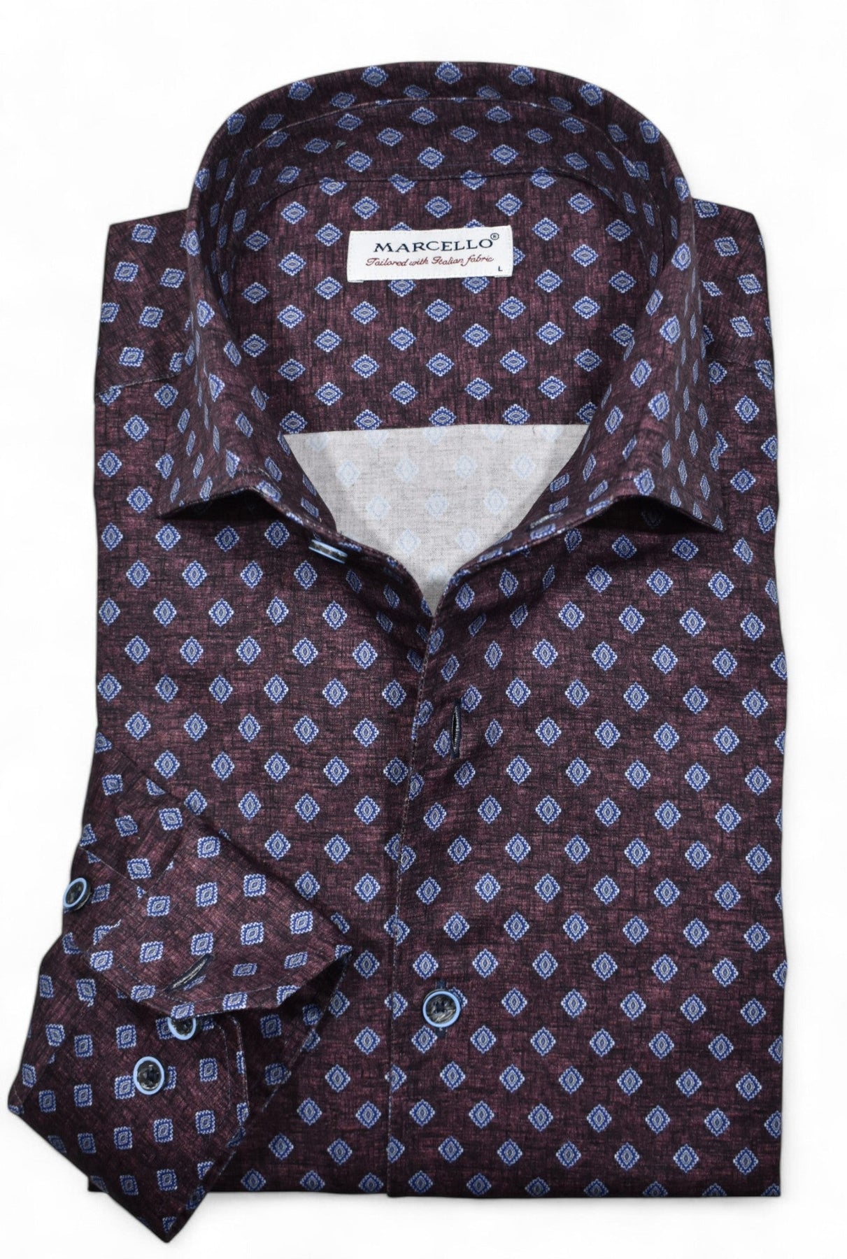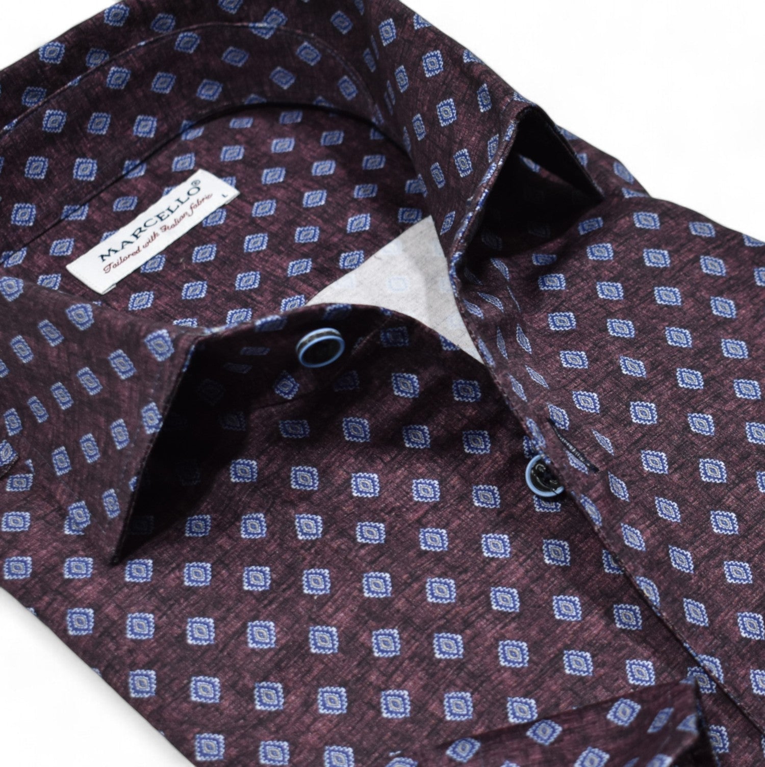 Elegantly designed with a ruby color and floating diamonds, our Marcello Ruby Diamond Roll Collar is made from soft cotton sateen fabric. It boasts a shaded ground, perfectly matched buttons, and the exclusive one piece roll collar by Marcello. Make a statement with this luxurious and unique piece.