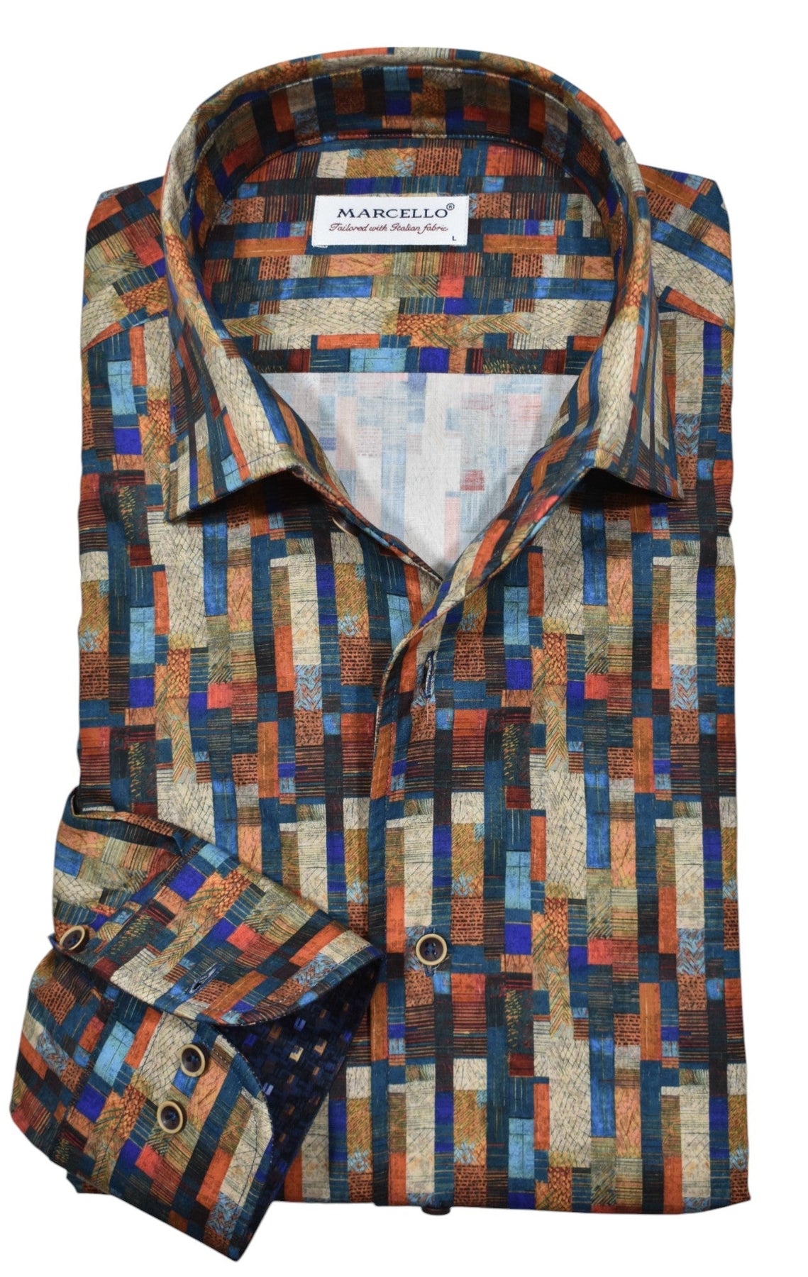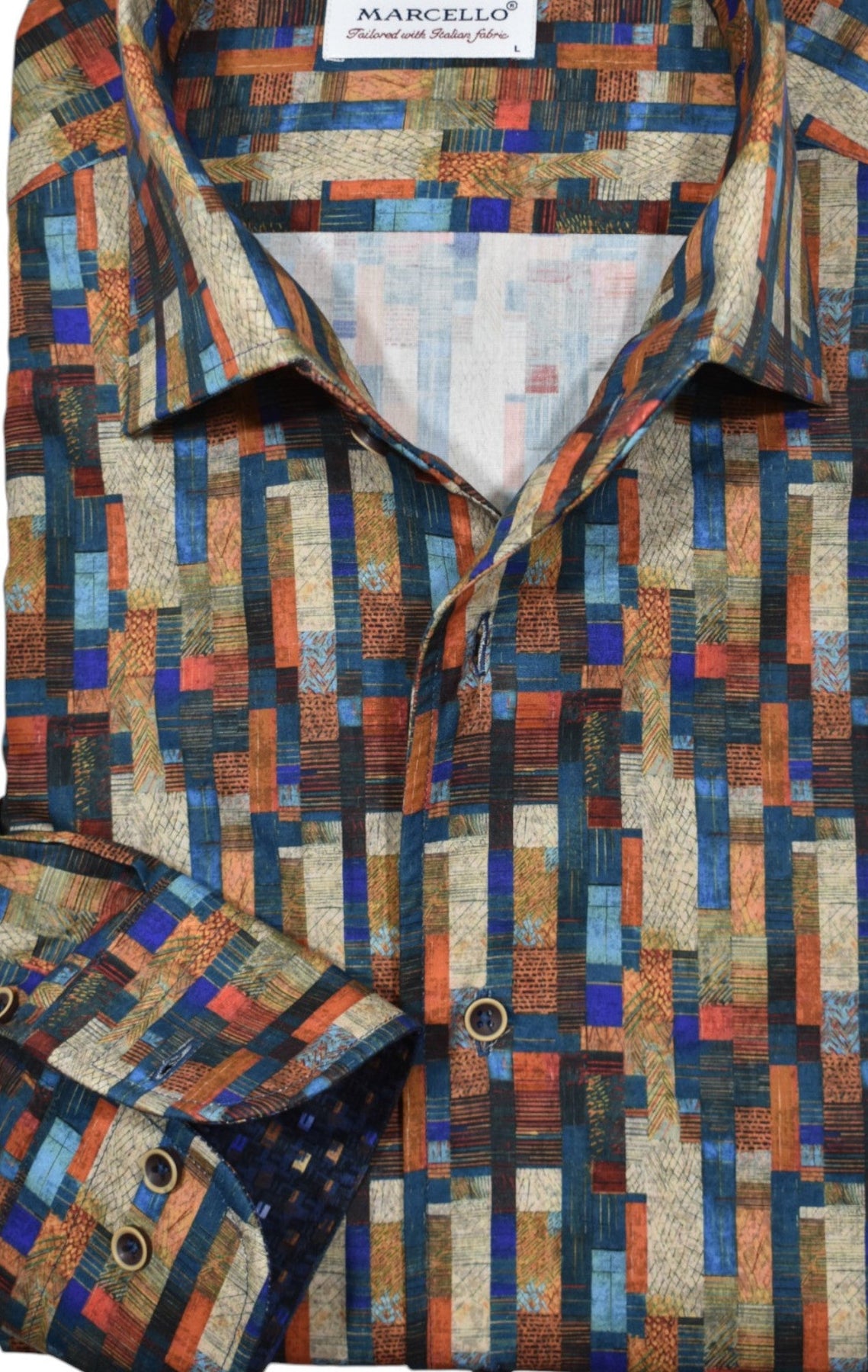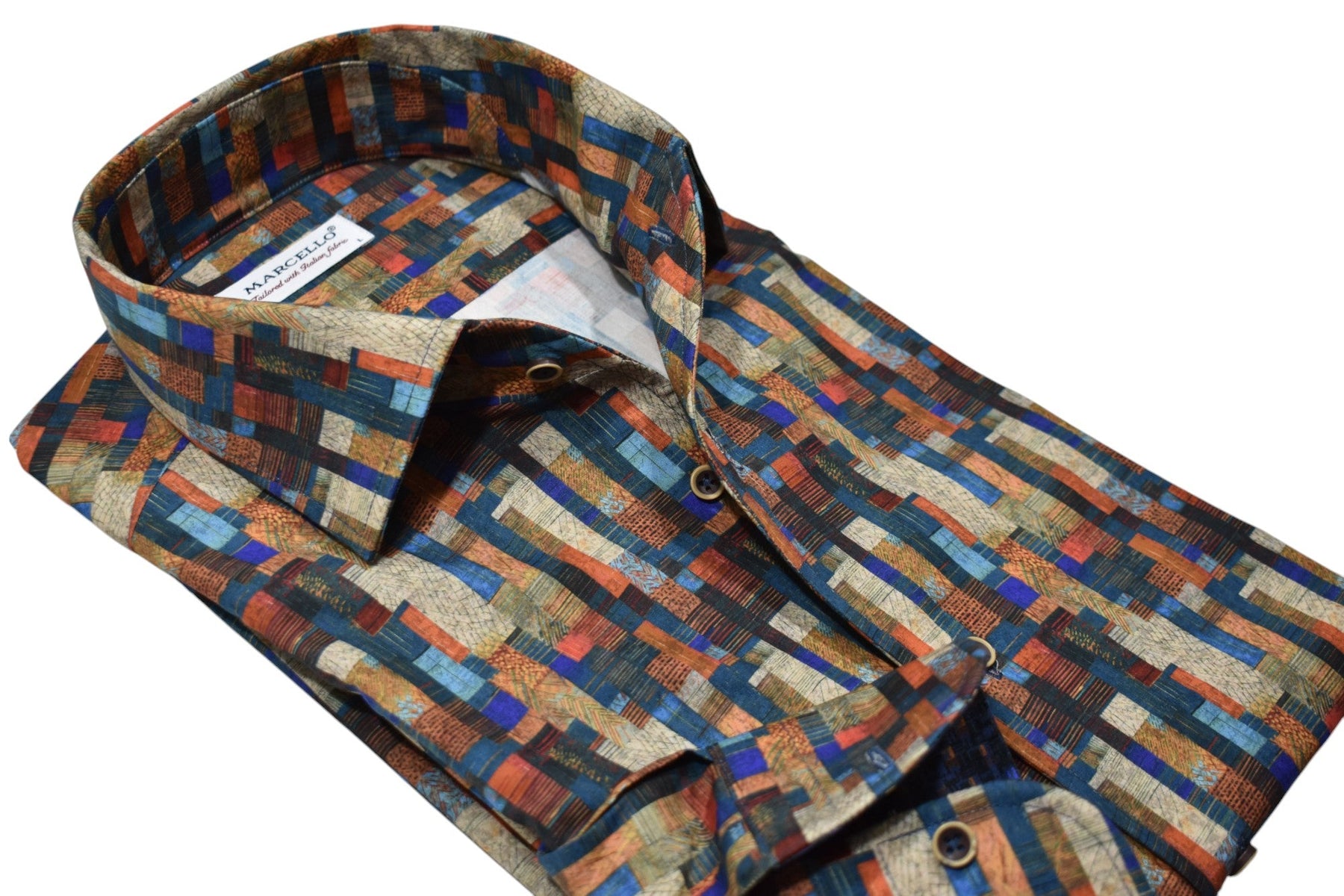 Experience the vibrant Tempe nightlife in style with our Marcello Tempe Color Block shirt. Crafted with soft cotton sateen, its rich colors and vertical grid pattern add a touch of sophistication to your look. Plus, the exclusive one piece roll collar guarantees a perfect fit all day long. Elevate your fashion game today!