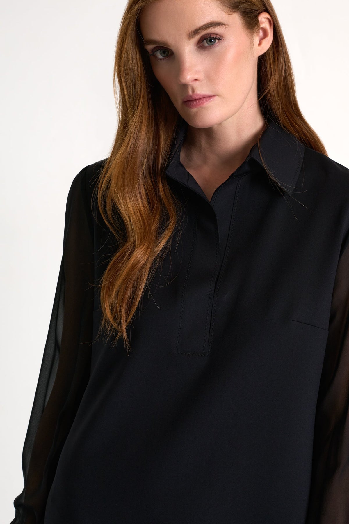 Elegant dress with delicate mesh sleeves, adding a modern, airy touch.