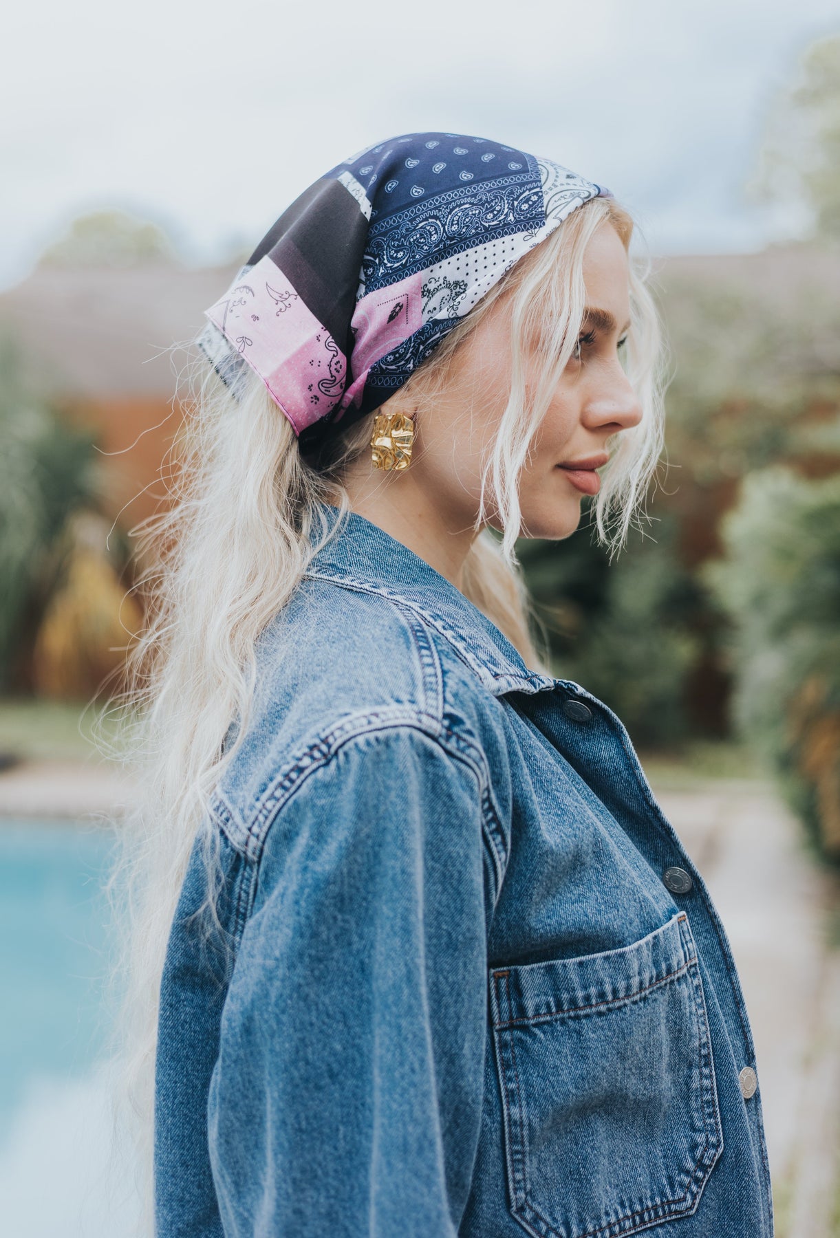 Embrace timeless style with the Patchwork Poise Bandana – a chic blend of pink, grey, and navy paisley patterns arranged in a stylish patchwork design. Framed by a bold black border, this versatile accessory combines classic charm with modern sophistication, perfect for adding a touch of effortless cool to any outfit.