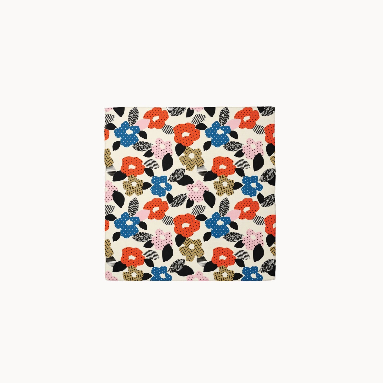 Step into bold style with the Wildflower Waltz Bandana – a striking mix of vibrant red, blue, and pink florals paired with graphic black and gold leaf accents. The playful yet modern design creates a dynamic, eye-catching look, perfect for adding a pop of color and personality to any outfit or accessory collection.