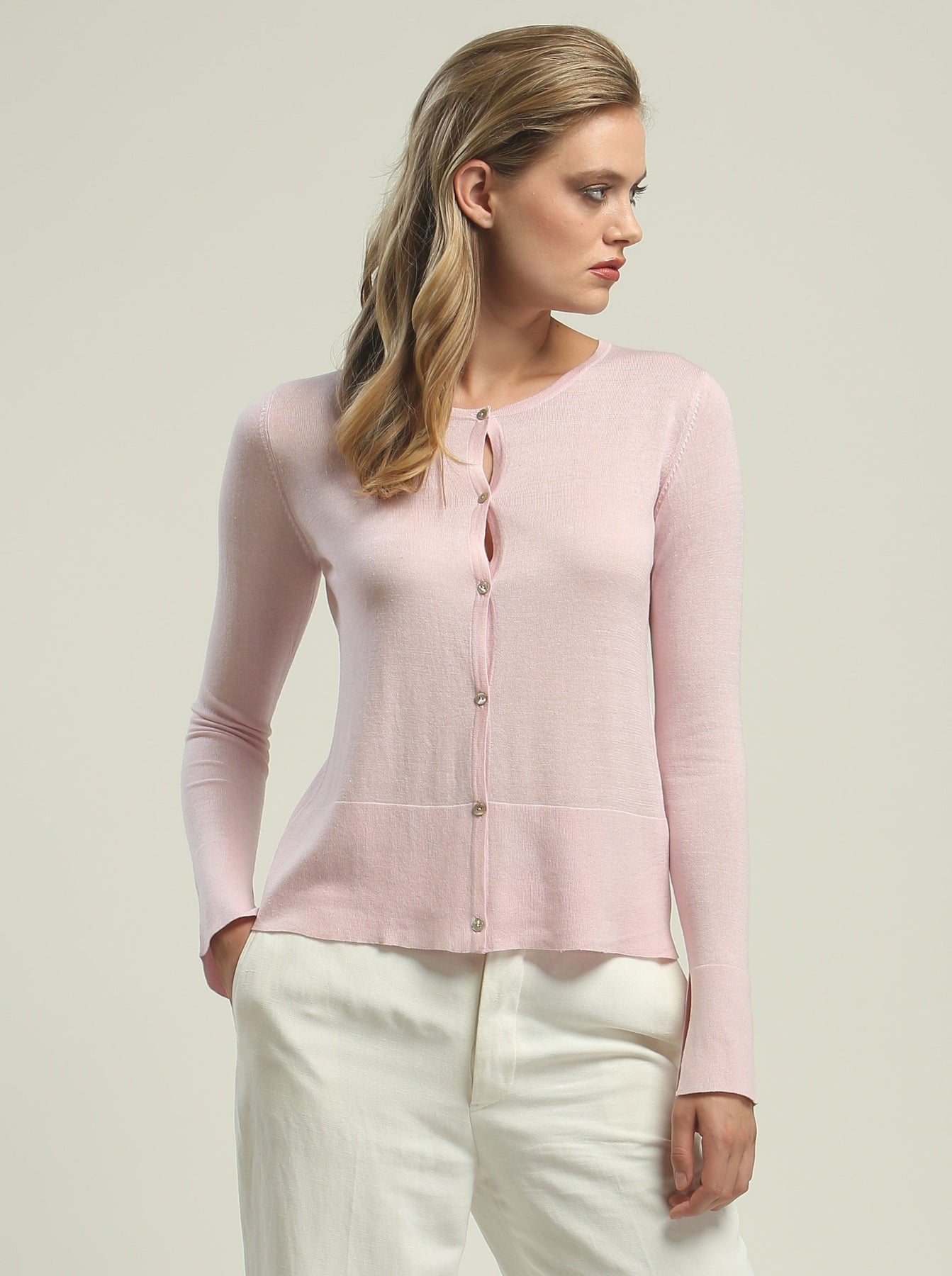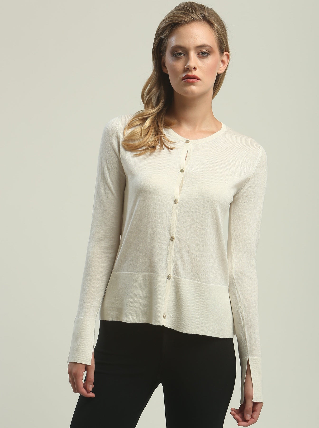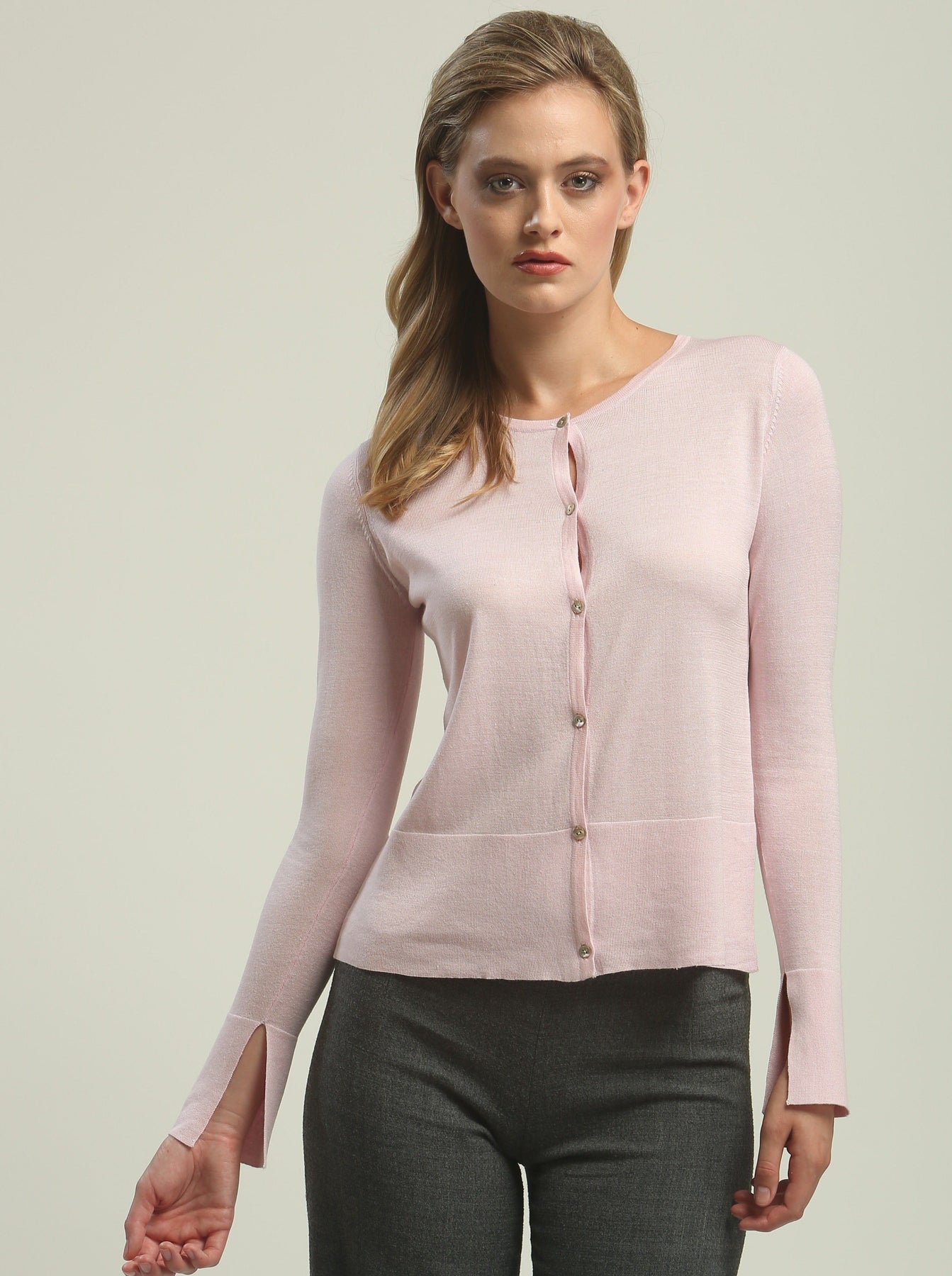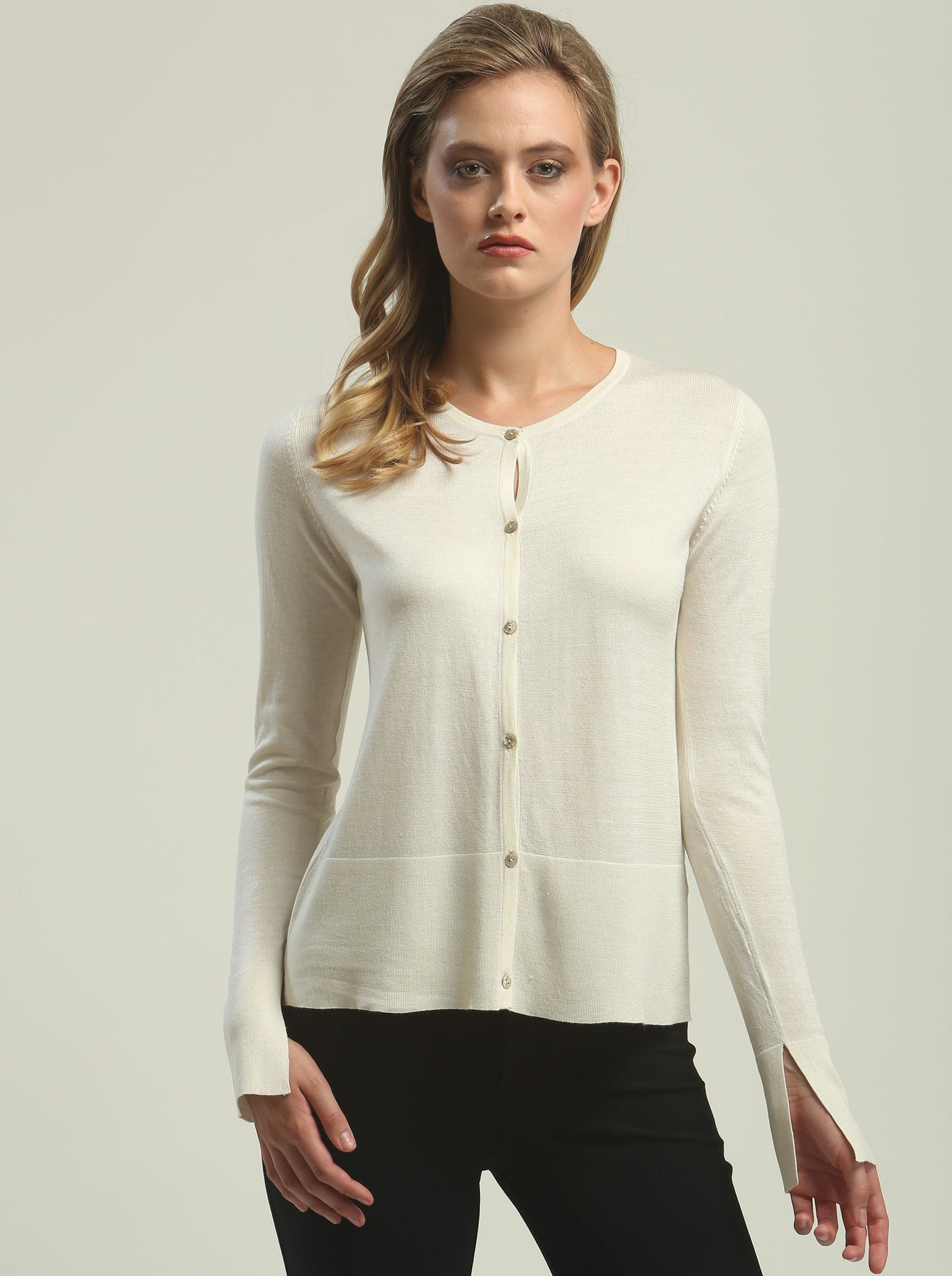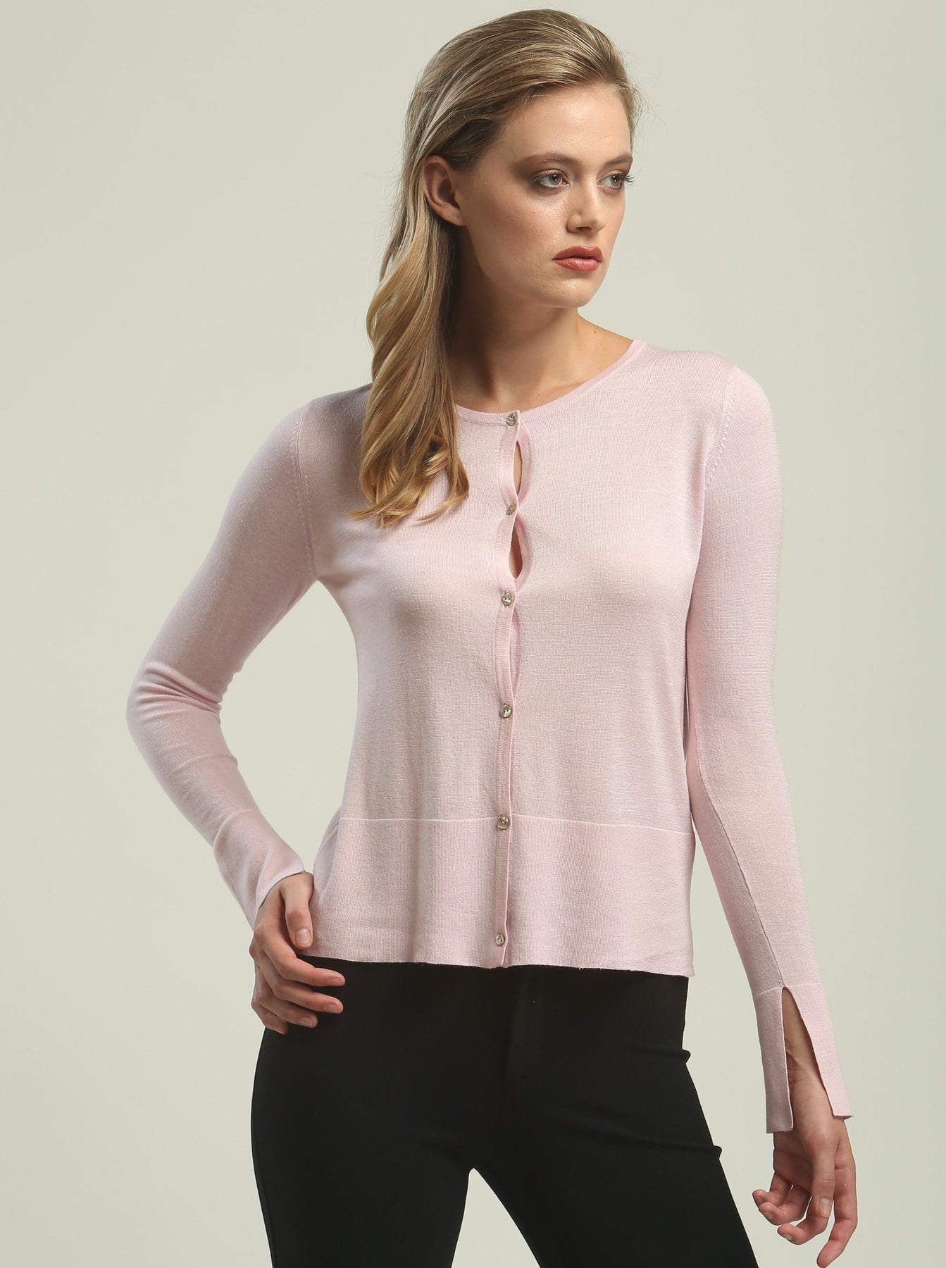 Our Classic Cardigan is a staple must have for your wardrobe. It features beautiful eye catching slits at the wrist, double stitched wide band at both cuff and hem, and mother of pearl closures. Wear it over your favorite camisole or tee. A versatile piece for work or play.