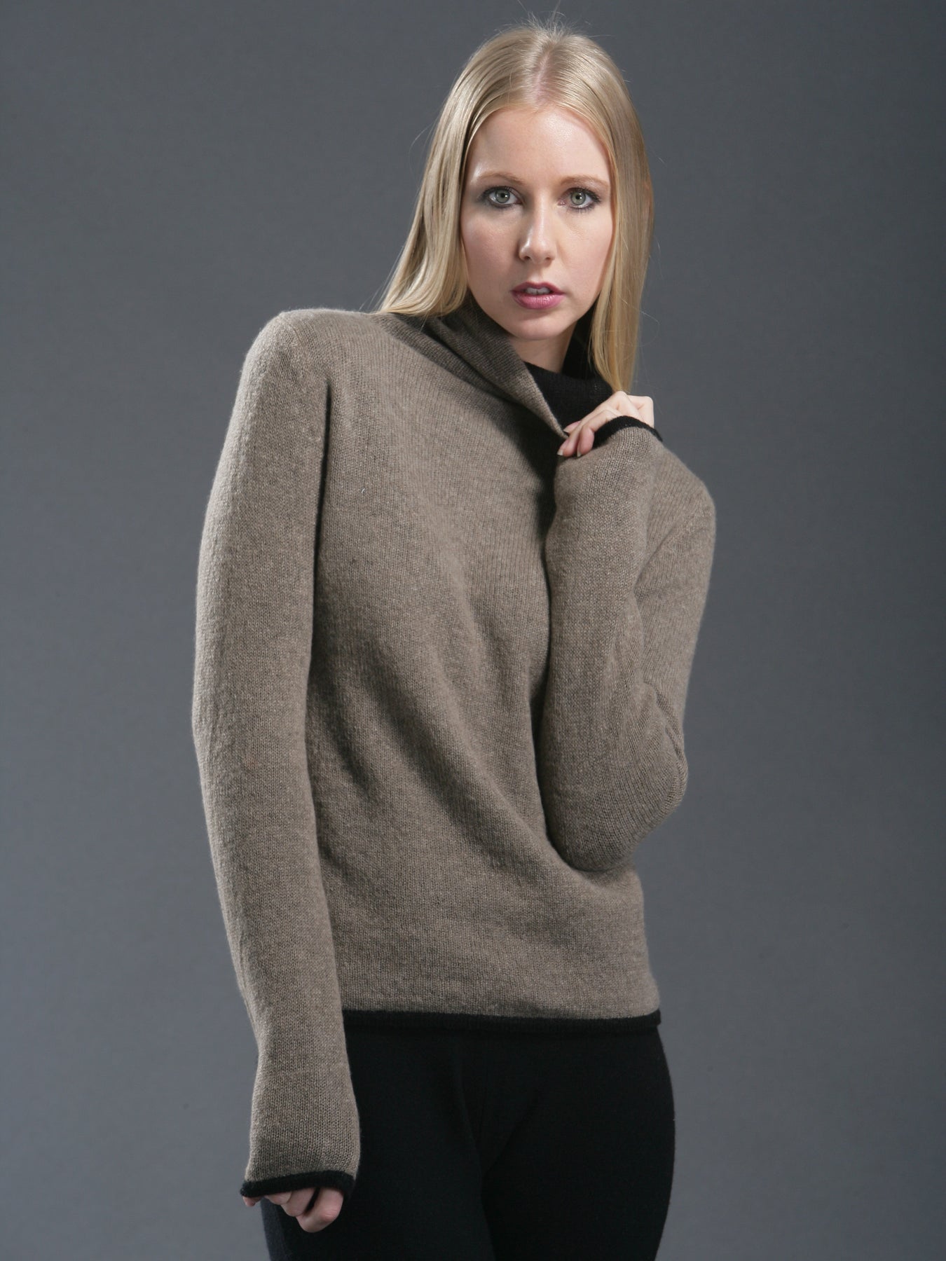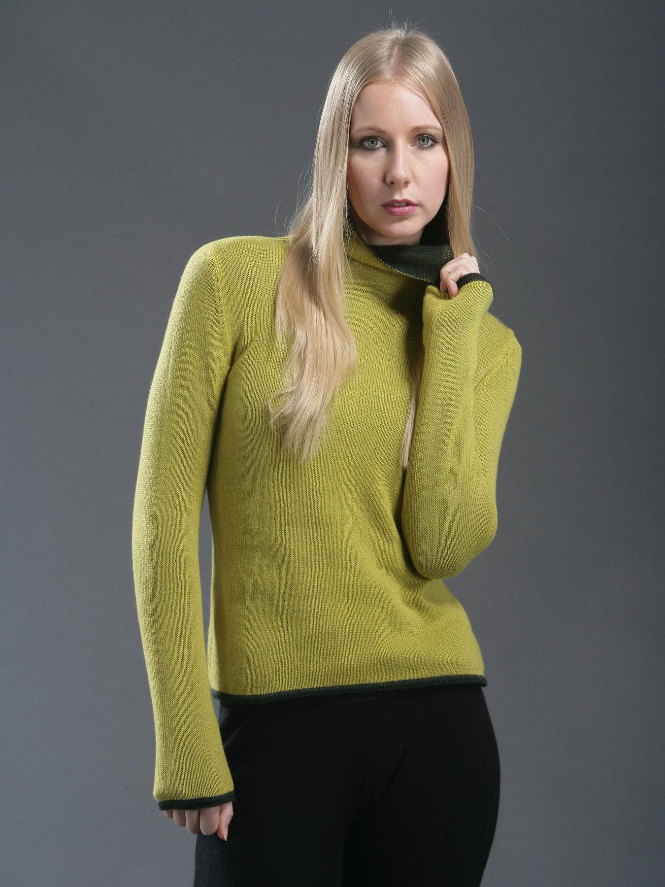 Our double layered reversible turtleneck is the best of two in one! Double layered with contrast edges around the neckline, cuffs and the bottom on one side. The two tone double layered design offers two in one by reversing inside and out. We love it layered over a jacket or on its own for a simple chic look.