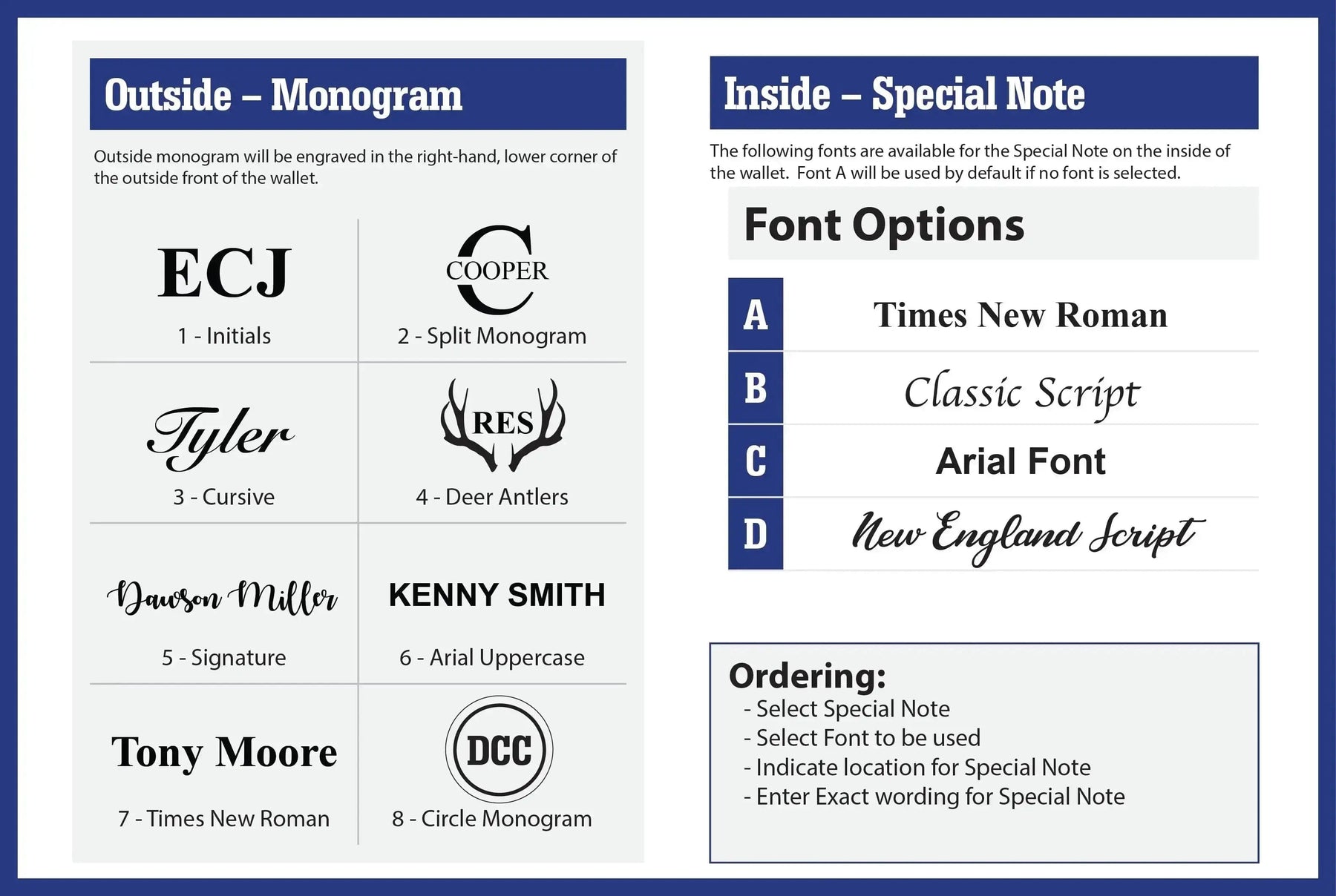 • Option to personalize your wallet on the right front bottom corner.  Variety of designs available.
