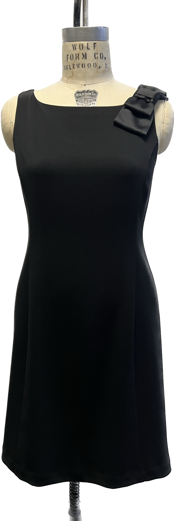 Slight flare boat neck shift dress w/ silk charmeuse bow that dangles longer towards the back.