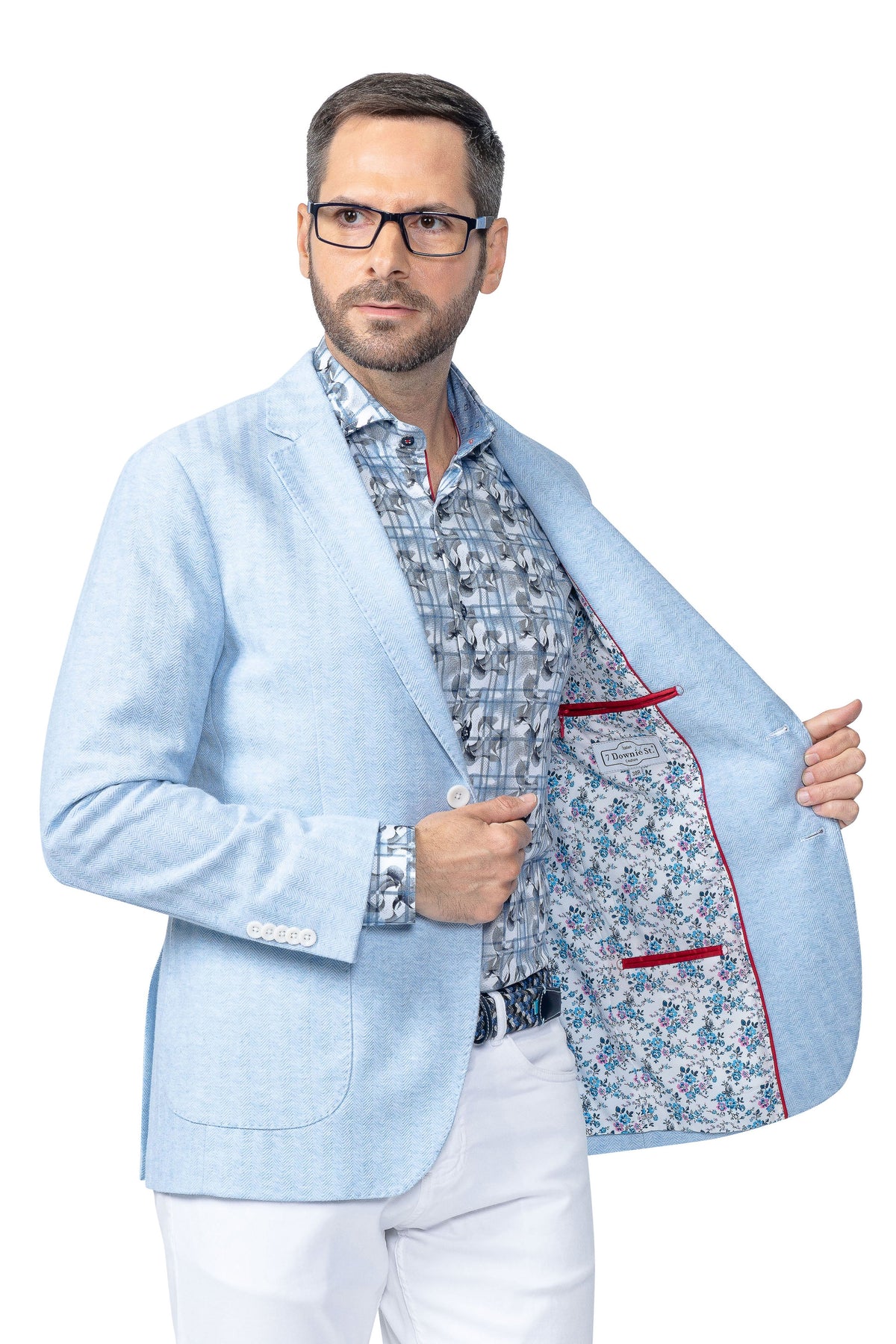 Introducing the Montclair Light Blue Herringbone Cotton Stretch Blazer, a quintessential addition to your wardrobe that embodies both style and comfort. This blazer is expertly designed to cater to all occasions, making it an indispensable piece for the modern gentleman.