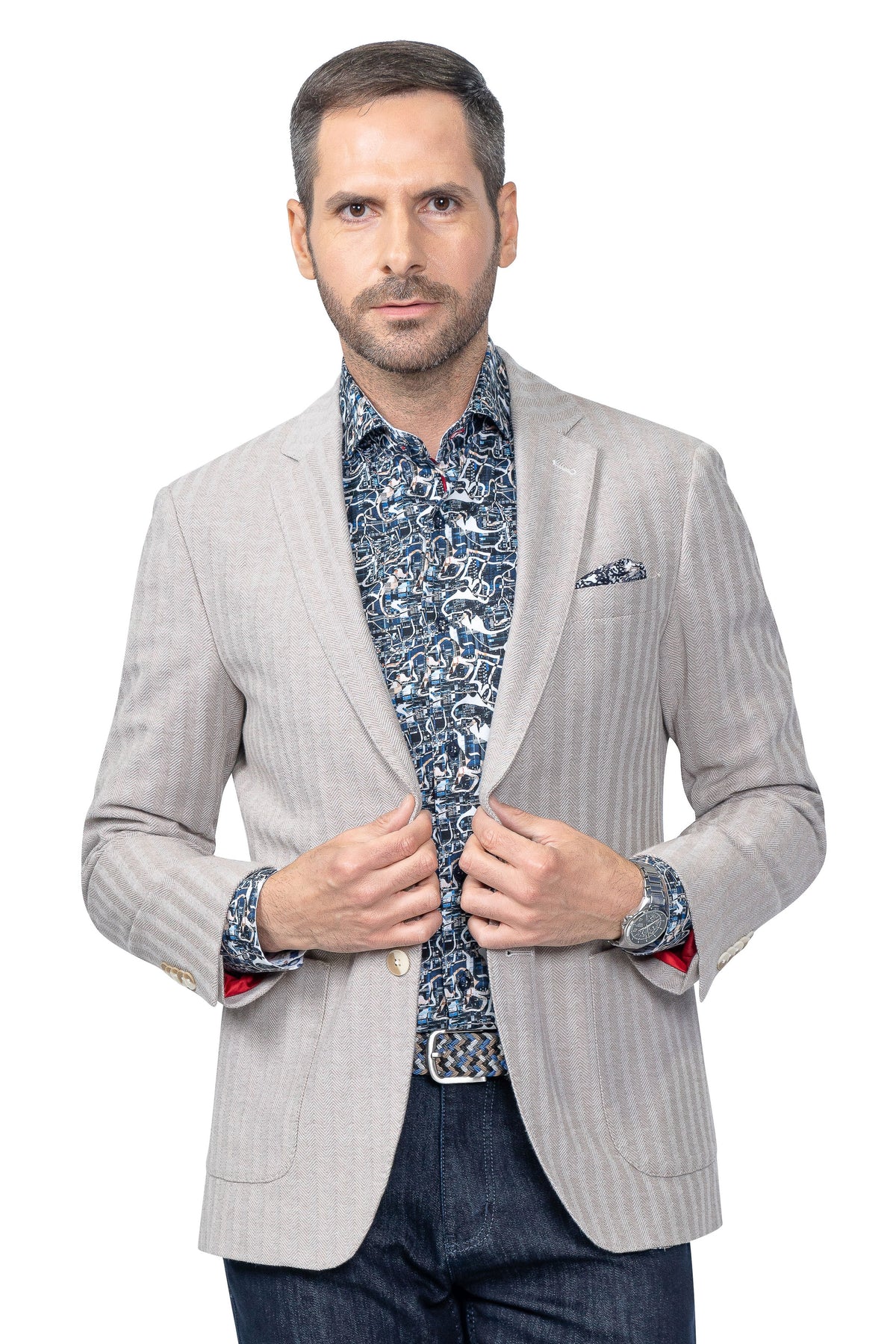 The taupe herringbone pattern adds a touch of class, making it suitable for a range of occasions. Pair it with a smart sport shirt and tailored trousers for a polished business look, or dress it down with a casual t-shirt and chinos for a relaxed yet refined outing. This blazer offers the ideal balance between formal and casual, making it a staple for any fashion-forward individual.
